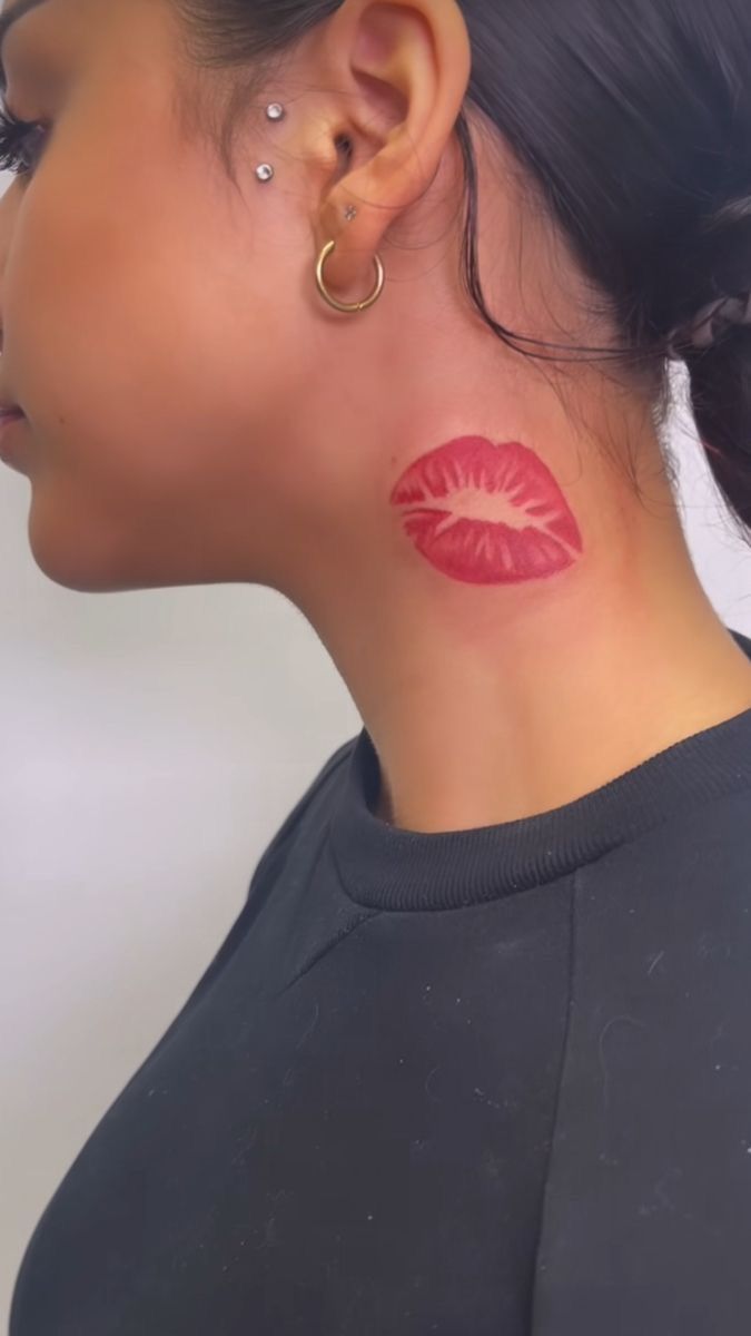 This neck kiss tattoo feels daring, confident, and undeniably sexy—like wearing a permanent flirtation just below the jawline. It gives off strong YOLO energy, celebrating bold choices and fearless self-expression.