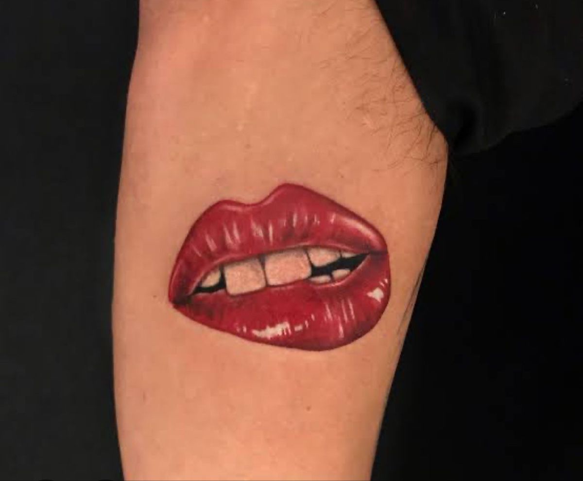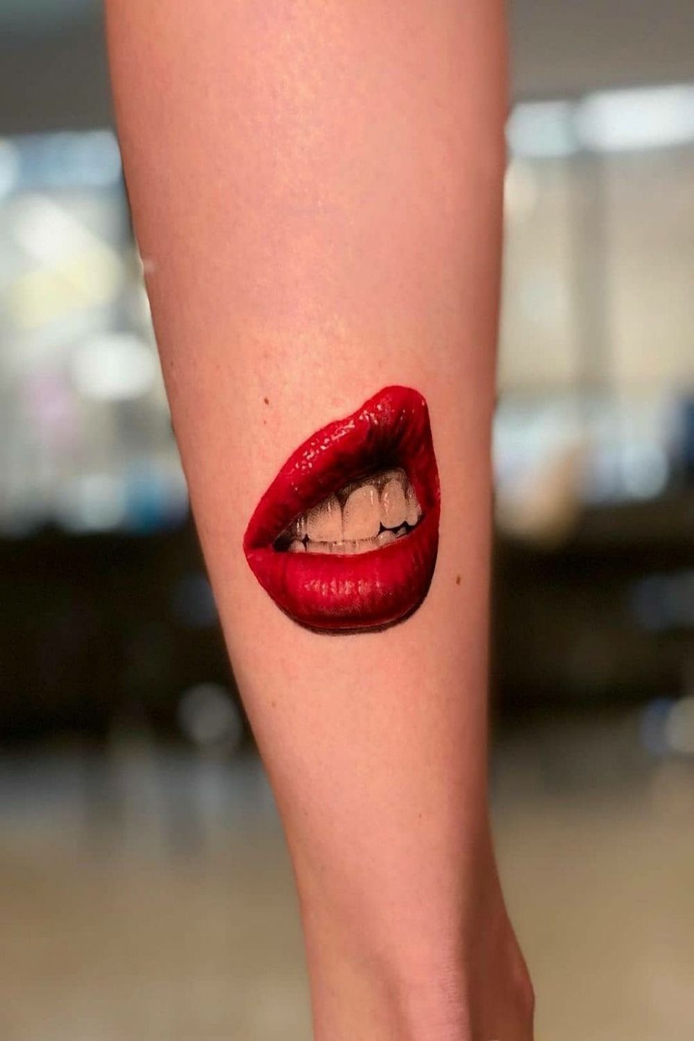 22. Hyper-Realistic Red Lips Forearm Tattoo
