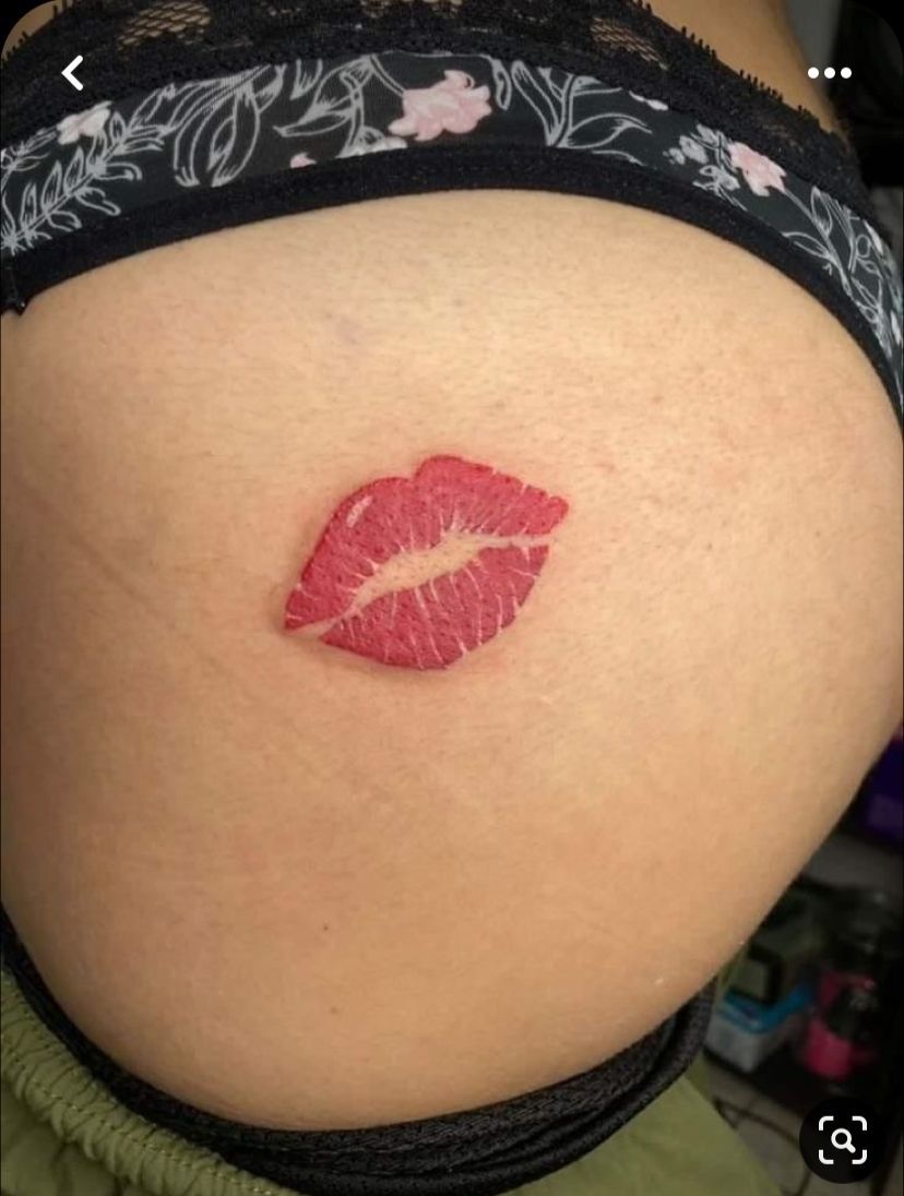 This soft pink kiss tattoo feels sweet, flirty, and quietly romantic—like a playful secret kept close to the skin. It carries a lighthearted, feminine mood that feels youthful without trying too hard, perfect for someone who loves subtle charm.