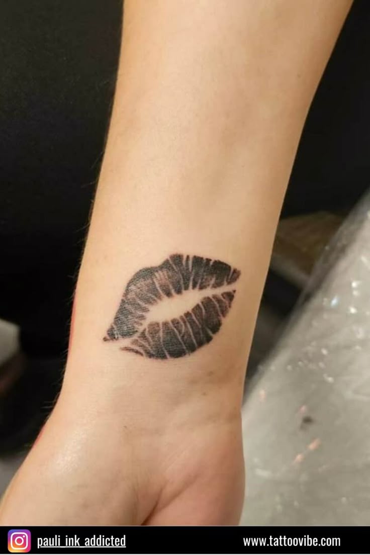 This simple black kiss tattoo feels intimate and personal—like a quiet reminder of passion, memory, or playful confidence. Its small scale gives it a discreet, modern appeal that still carries emotional weight.
