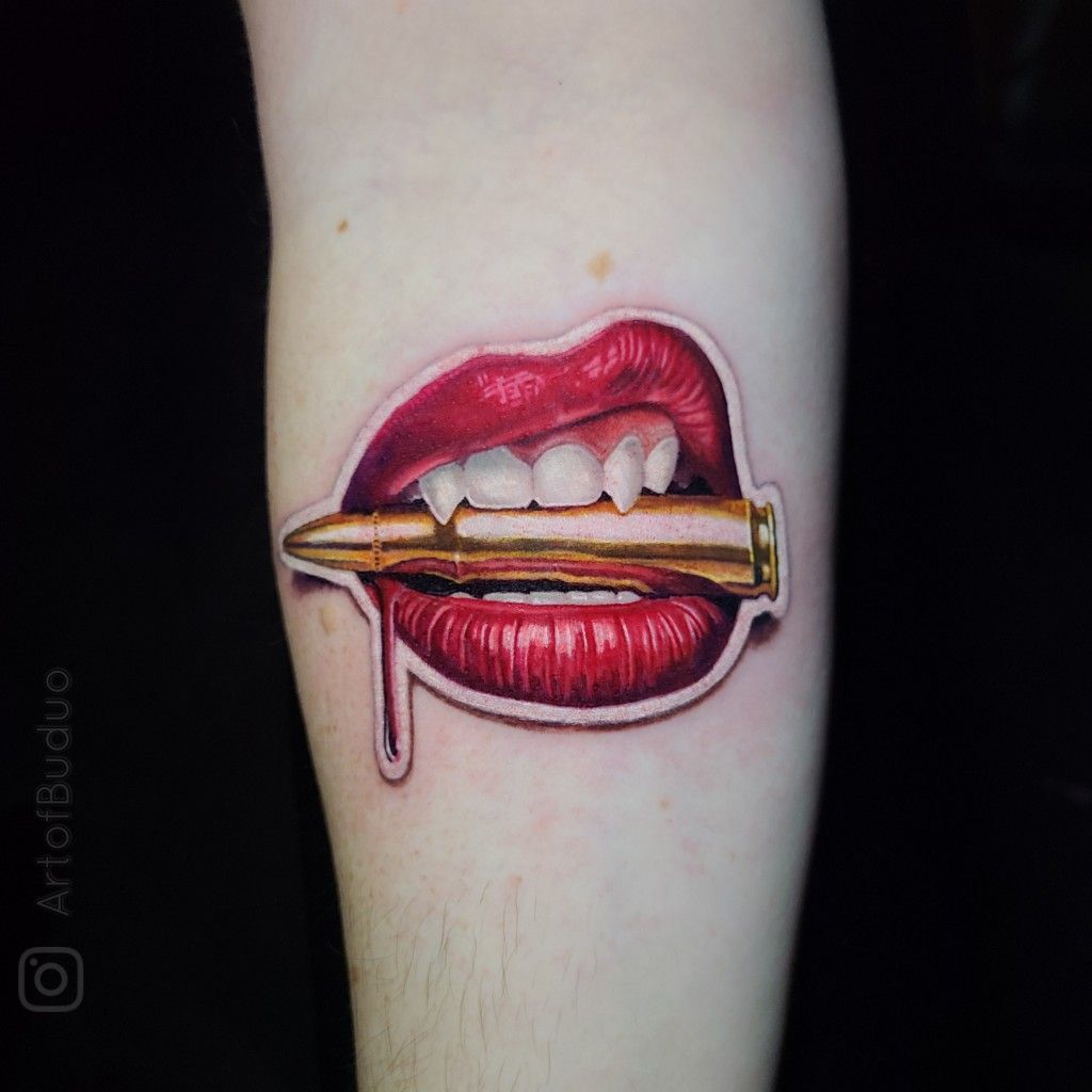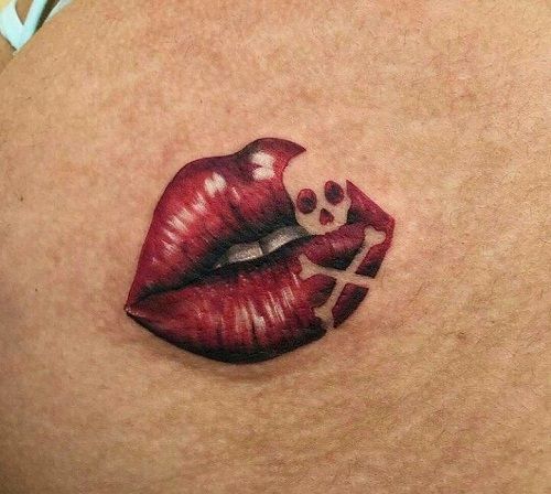 This creative lips tattoo featuring a bullet feels edgy, rebellious, and packed with attitude. It combines beauty with danger in a striking visual metaphor that feels bold, artistic, and unforgettable.