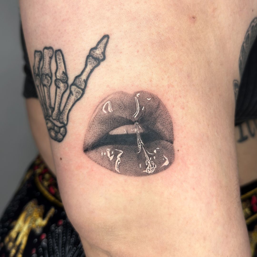 This black-and-grey lips tattoo feels sleek, modern, and subtly provocative—like a monochrome version of classic glamour. The glossy highlights add dimension, giving it a refined, editorial-quality finish.