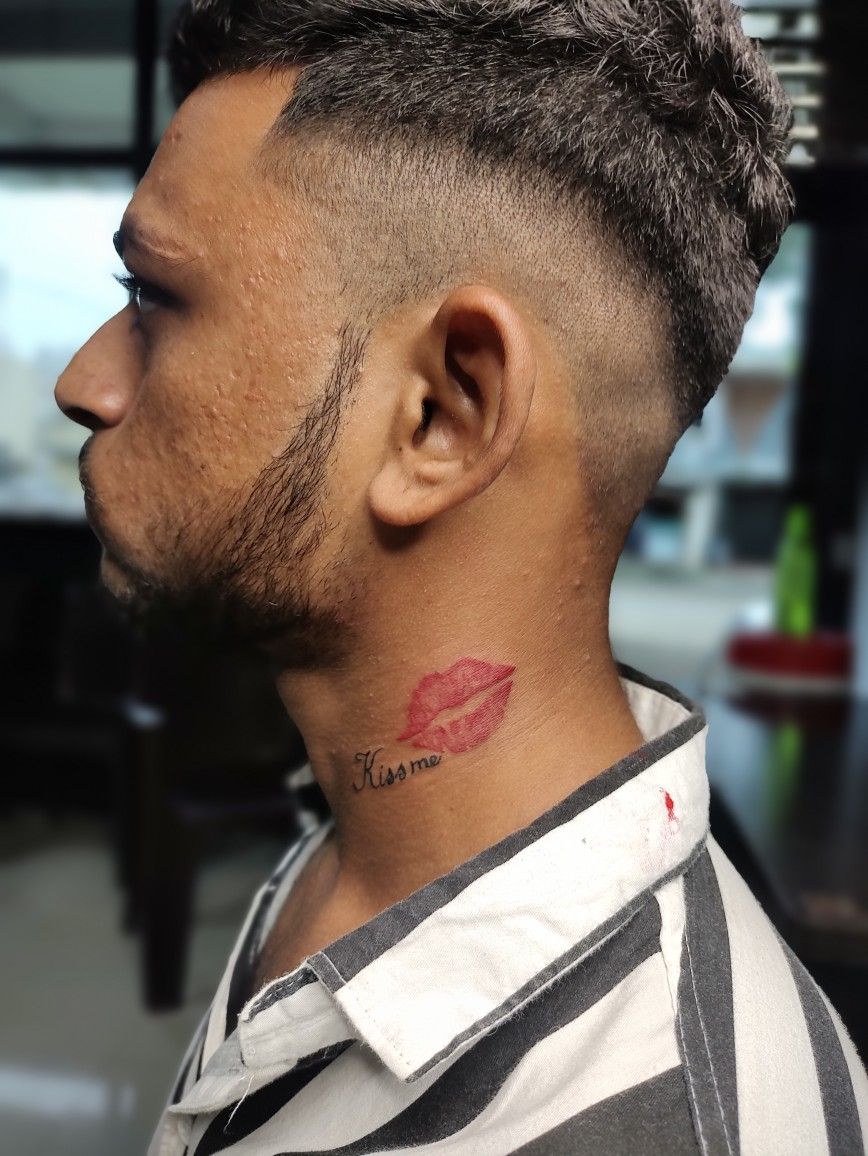 This neck placement gives the kiss tattoo a daring, confident, and rebellious energy—like wearing a bold statement that speaks before you do. It feels edgy, modern, and unapologetically cool.