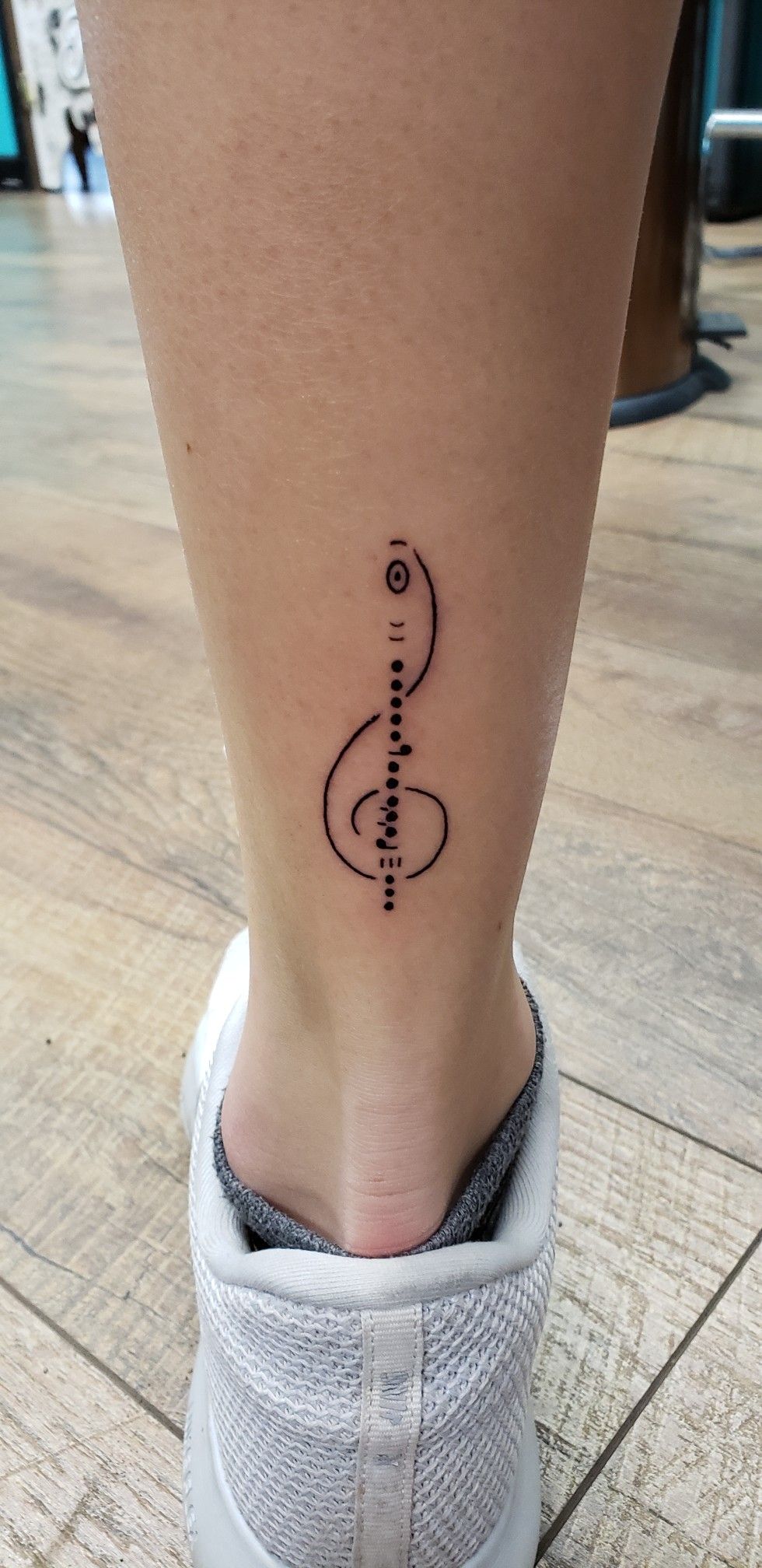 This tattoo takes the music theme in a more abstract direction, and that makes it feel instantly more contemporary. Instead of a standard note or clef alone, the design stretches into dots, curves, and negative space that almost feels like rhythm translated into modern art. It is sleek, unusual, and quietly sophisticated. I love tattoos like this because they make people pause for a second. They are not loud, but they are memorable. The clean vertical placement along the leg also gives the tattoo a graceful elegance that feels very intentional and beautifully understated.