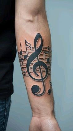 This design has that strong visual impact people usually want when they say they love music and want everyone to know it. The oversized treble clef is bold, sculptural, and impossible to miss, while the background notes give it dimension without making the whole thing too complicated. There is a sleek confidence to a larger piece like this. It feels intentional, not impulsive. It is less about a cute little symbol and more about turning music into a proper art statement on the body. That makes it especially appealing if you like tattoos with presence.