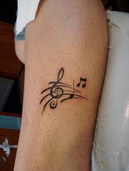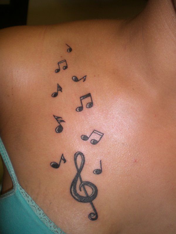 This shoulder tattoo feels light, feminine, and a little dreamy, like a melody floating upward into open space. The larger treble clef anchors the design, while the smaller notes give it that sense of motion that makes it feel alive. It has a softness that works beautifully on the shoulder because the body itself already gives the piece a graceful curve. There is something very easy and romantic about this kind of composition. It is not trying to be sharp or edgy. It is meant to feel open, musical, and gently expressive, and it absolutely does.