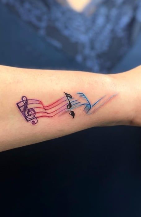 If you usually wear soft colors, polished nails, or lighter makeup, this tattoo ties in beautifully with that kind of styling. It is especially lovely on the wrist because the piece reads almost like a painted bracelet. Just remember that watercolor effects can soften over time, so go to an artist who has real experience with color transitions and expect possible touch-ups down the line. As far as what makes this one unique, it is the emotional lightness. It feels less strict, less formal, and more like music as feeling rather than theory.