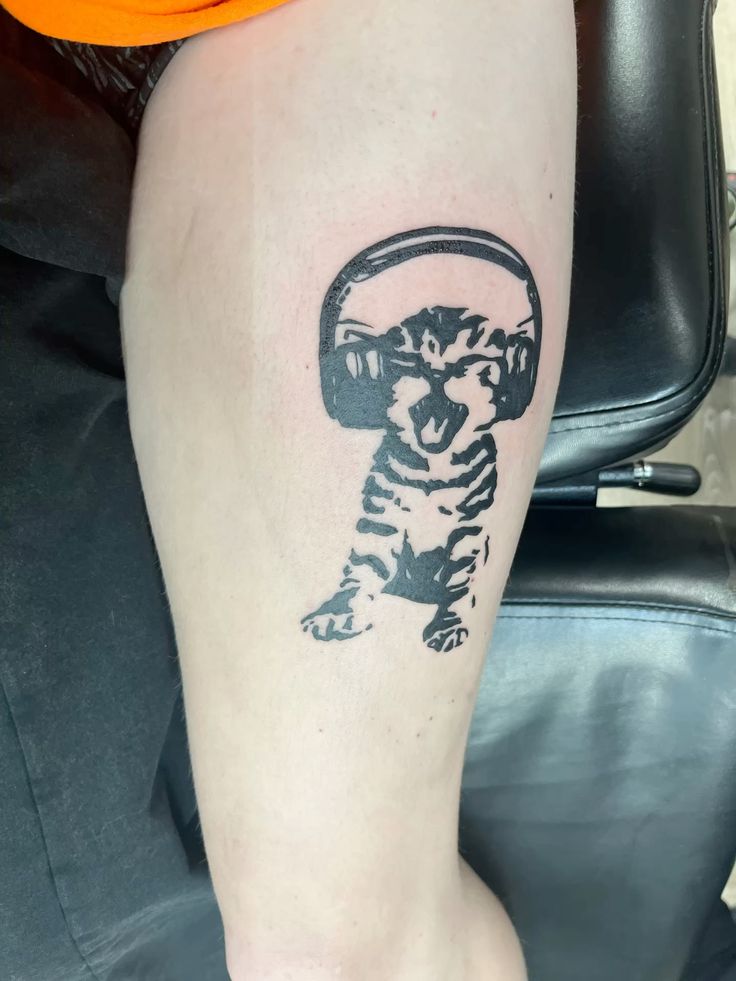 Equal parts sass and comfort, this little tiger cub roaring under oversized headphones brings instant joy. It’s the inner hype-woman we all need—small, fierce, and ready to hit play on a Monday. The graphic blocks and negative space keep it crisp from across the room, while the subject adds just the right wink. Wear it with a leather jacket for a metal attitude or a cozy sweater for school pickup; either way, it’s a mood. What makes this cut special or unique: Animal-plus-gear tattoos are trending, but the kitten’s open-mouthed belt is a unique twist for women that reads confident, not cute. Light texturing around the ears references The ear without spelling it out. For men musicians, a foreleg or calf placement gives room to breathe. Pair with stars or a tiny Hamilton quote if Broadway anthems are your jam.