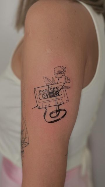 A cassette labeled “mixtape” trails ribbon into a treble clef while a flower leans in—nostalgia meeting right-now elegance. It gives house-party warmth: friends, laughter, and a kitchen dance break. The linework keeps it light, the bloom adds grace, and the tape ribbon ties it all together. If playlists shaped your high school years, this one hums. Motivation to try it now: the cassette comeback is real, and this design packs memory and movement into a tidy layout. It looks stunning on the upper arm or near the ribs, and it adapts to designs for men or designs for women by adjusting the bloom. Start simple, then add a date, a country lyric, or a star to make it uniquely yours without overcrowding.