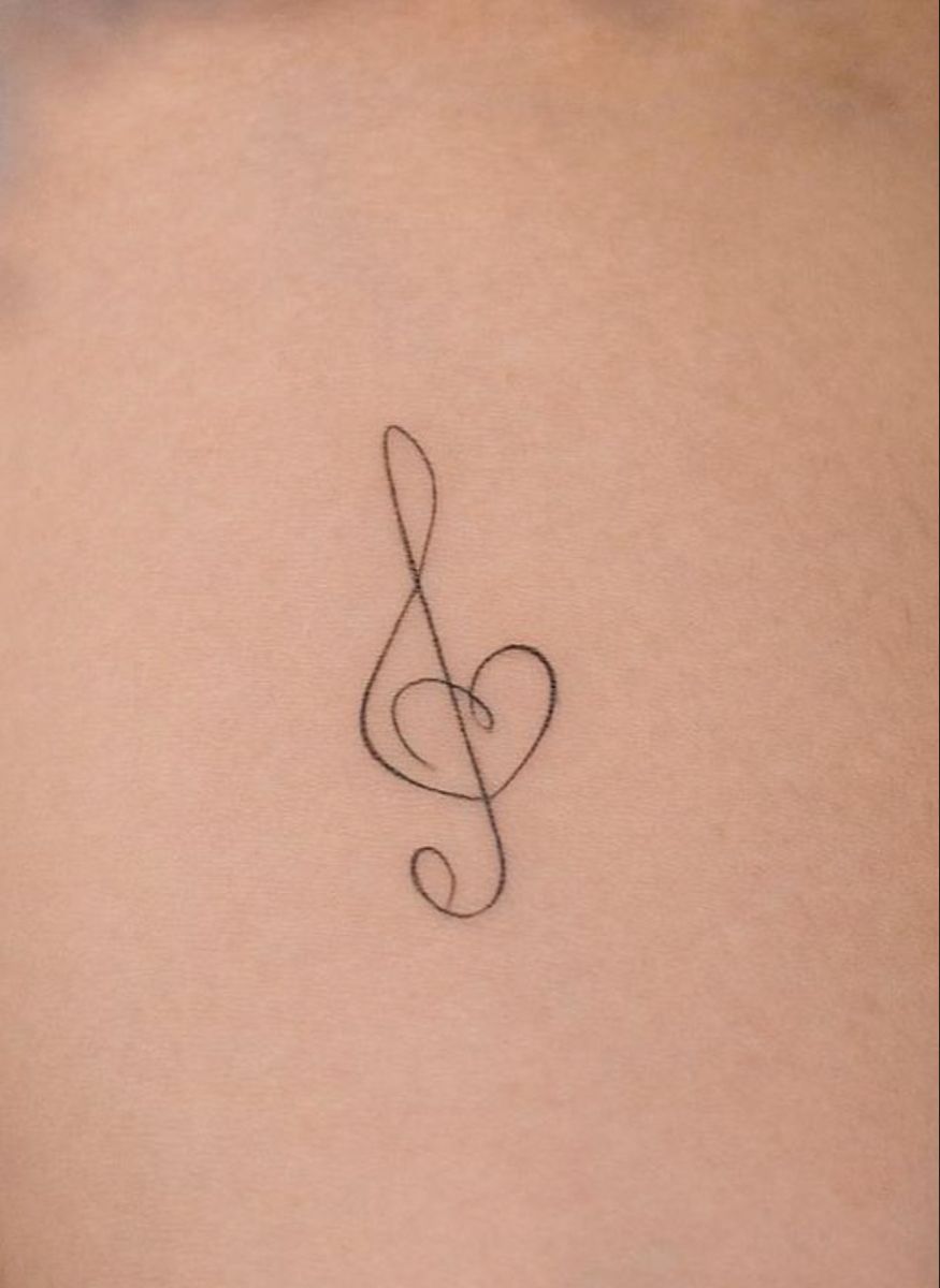 Simple line, big feeling. This delicate clef curls into a heart—the visual of loving what you love, without explanation. It’s whisper-thin and elegant, like jewelry you never take off. Slide it near the collarbone, inner arm, or neck for a romantic accent that still reads grown-up. If you want minimalist ink that hints at your playlist, this is it. Current trends (2025): Ultra-fine single-needle marks with micro flourishes are everywhere. To keep this aesthetic crisp, ask for a slightly heavier downstroke and gentle tapering at the top loop. It layers effortlessly with other designs for women, and it’s a friendly starting point for sleeves—add a few floating notes, a moon, or a country lyric as your story grows.
