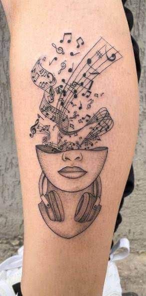 Notes, staffs, and symbols pour upward from a serene face—like ideas floating out when the right song hits. It’s dreamy, clever, and a little surreal; you can almost hear the chorus escape. The open composition feels airy on the calf or tricep, giving that gallery-sketch aesthetic without heaviness. If you love big ideas that stay feminine, this is a showstopper. What to wear it with: sleeveless tees, denim shorts, and a swipe of lipstick—let the linework breathe. Add small stars or a crescent to echo the upward motion. For festival days, stack bangles; for office hours, keep it clean and let the design speak. Pairs beautifully with a tiny ear note behind the neck or a simple wrist symbol for layered storytelling.
