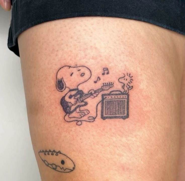 This tiny scene plays like a Saturday morning you never outgrew—guitar humming, amp warm, and a faithful friend nodding to the beat. Cartoon lines keep it light, while the amp’s texture gives it that gig-night buzz, the sound of small joys turned all the way up. It’s a playful nod to Rock without the leather and smoke, a unique aesthetic choice that says you know how to have fun and keep it sweet. Wear it with denim shorts or a breezy dress; it’s the tattoo that smiles back every time you catch it. Who it’s for: great for designs for women who want personality without heaviness, and just as charming for men who like a wink of nostalgia. Works well on the thigh or calf, where the rectangle amp sits neatly; scale smaller for the ankle or near the ear as a micro moment. If you’re building sleeves, sprinkle in stars or tiny notes to let this simple vignette riff with the rest.