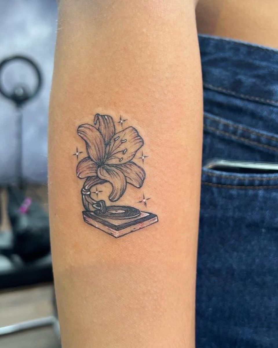 How charming is a tiny record player sprouting a lily? It is the house party meet-cute of your dreams: vintage vinyl spinning, laughter in the kitchen, and a flower vase catching the late light. The mix of linework and gentle sparkle gives it fairytale whimsy while keeping it polished and unique. Vibe check: this little beauty reads optimistic and creative. The friend who always has a playlist ready. It can be placed near the inner arm or by the neck for a delicate statement; it also tucks nicely close to the ear line. This is a perfect gift for storytellers, men who love analog gear, and designs for women who want a fuss. If you expand, add micro stars or a lyric in cursive.