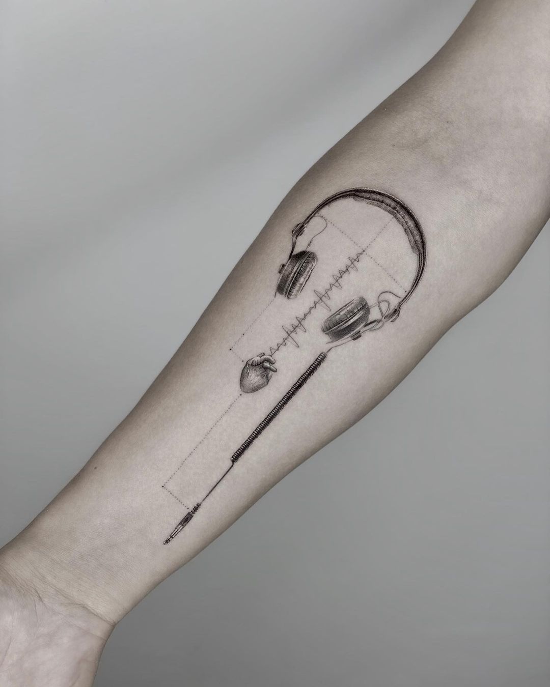 Hyper-detailed headphones arc over a slim cable that turns into a heartbeat—studio gear meets pure feeling. It’s a love letter to long walks, late-night mixes, and the way a track can change a morning. The pencil-shaded texture gives it that technical, almost blueprint aesthetic, so it feels smart and stylish at once. The vibe or attitude: calm competence with a side of passion. On the forearm it reads “purposeful,” like you’re always dialed in. If you’re building sleeves, the straight cable anchors other elements—lyrics, the ear stars, or a tiny neck note. For men or female collectors who prefer precision over clutter, this is quietly epic—the kind of epic that gets compliments at coffee shops.