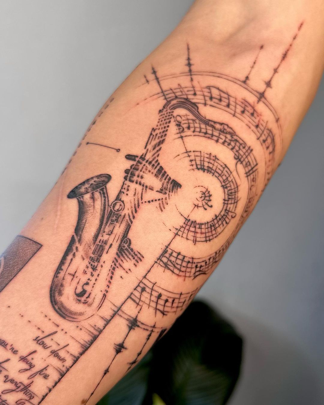 This piece feels like a city evening: a saxophone sketch unfurling into concentric staves, as if the melody is circling a rooftop at golden hour. It’s architectural yet romantic—jazz club glow, laughter, and that long exhale after the solo lands. If you’re drawn to movement and designs, this delivers high drama without losing elegance. Trend lens (2025): Instrument silhouettes with technical textures are having a moment, especially for forearm layouts. Artists are layering dotwork halos and spiral staffs for a modern aesthetic that photographs beautifully. It’s strong on forearm sleeve concepts for men and equally striking for designs for women who want statement ink that still reads sophisticated. Pair with starbursts or a small ear motif to echo live-sound sparkle.