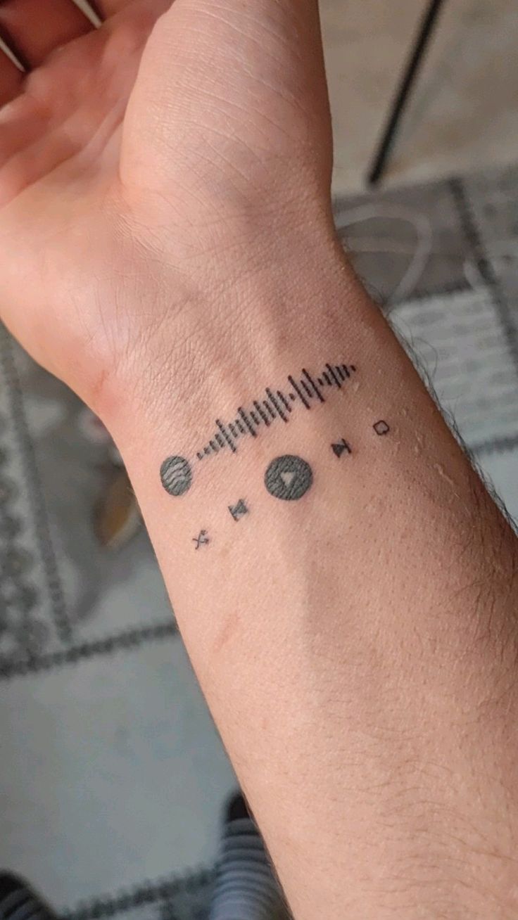 A compact band of play, skip, and a little waveform—like a private dashboard for your day. It’s crisp and modern, the perfect minimalist reminder that you decide the tempo. This tiny wrist piece sneaks under a bracelet but still sparks conversation when you hand someone your coffee or reach for keys. Unique, small, simple, and very now. Low-maintenance angle: line-only symbols age well on the inner wrist if you moisturize and use SPF. Ask for slightly rounded corners so edges stay smooth. If you want more presence later, extend the waveform or add a timestamp from a song. Works for men and designs for women; also a great match tattoo for men on the arm with mirrored controls.