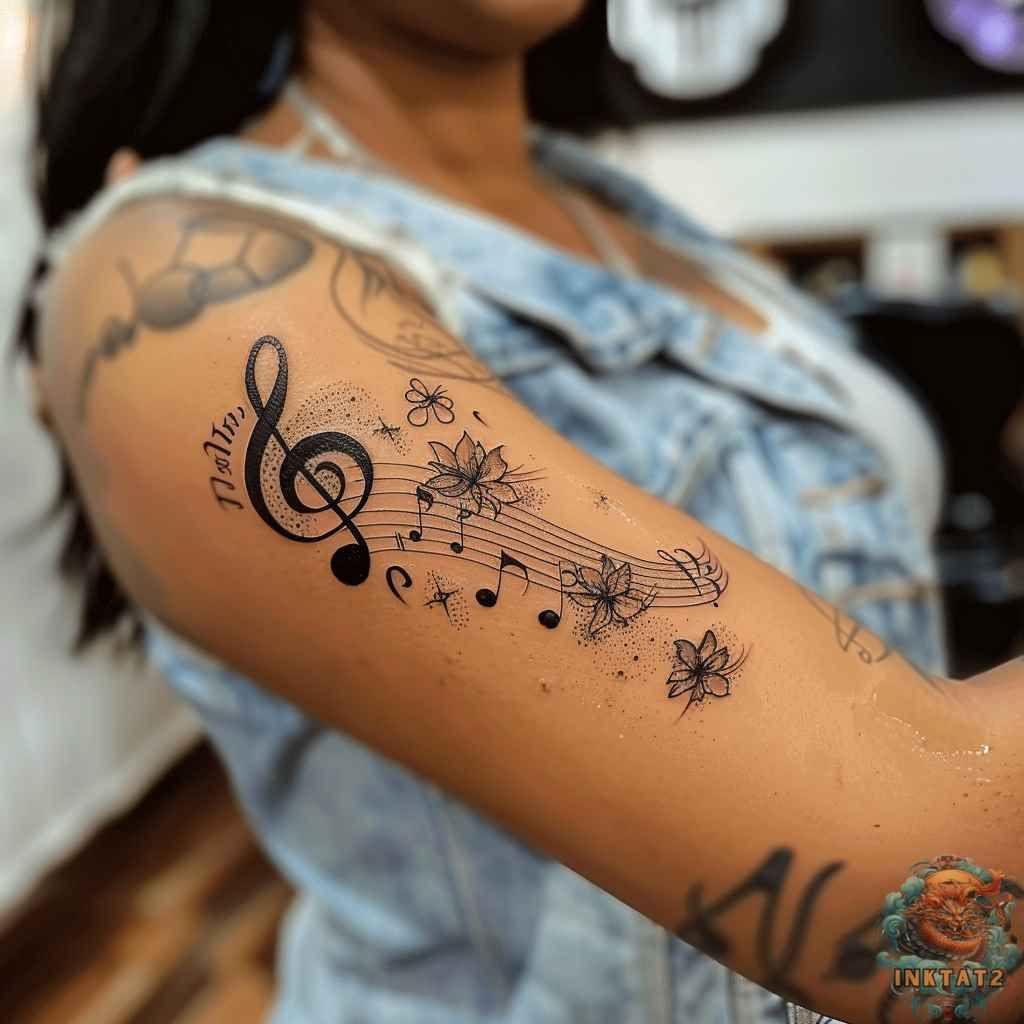 A treble clef sits among airy flowers, like spring on your shoulder. The dots and petals dance together, softening the staff so it reads feminine without being precious. It’s a graceful ode to growth—how playlists evolve as we do. Think Sunday brunch, a breezy dress, and a little sparkle. Designs for women rarely feel this balanced and unique. Low-maintenance angle: dotwork shading ages gracefully, and touch-ups are simple. Place it on the upper arm for men or on the arm or female biceps; the curve keeps the clef crisp. Daily SPF preserves the soft gradients, and a thin outline keeps petals clear over time. Add a tiny neck star or the ear note later if you want a flowing set.