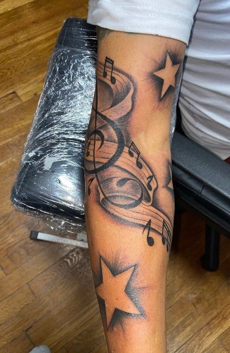 Music unfurls like a banner here, curling around the forearm with stars that feel both retro and road-trip fresh. It’s cinematic—the sound of a chorus rolling down the highway, windows open, hair flying. The flow flatters movement and makes your arm look longer, which is always a little wicked in the best way. What to wear it with: lean into contrast—sleek bangles, a cuff, or a stack of rings to echo the curves. Tank tops, denim, and a red lip amplify the aesthetic. If you love rock, weave in tiny lightning bolts; if you’re more metal, deepen the shading. This scales well for men musicians and designs for women and can evolve into full sleeves later.