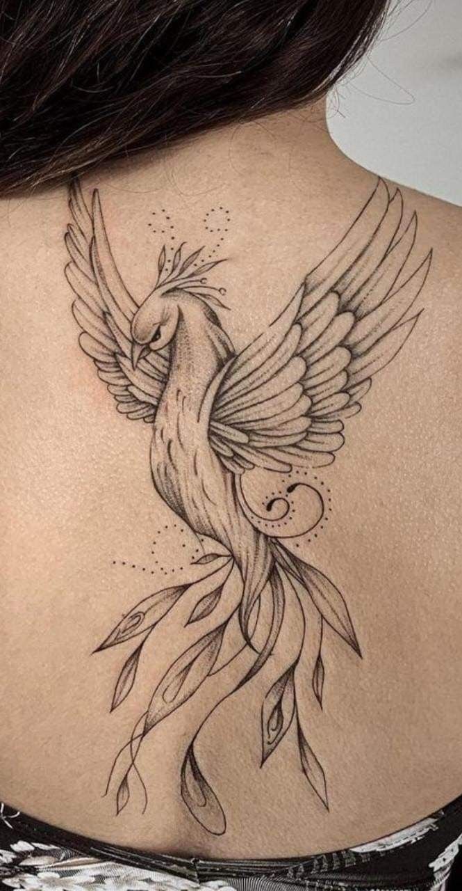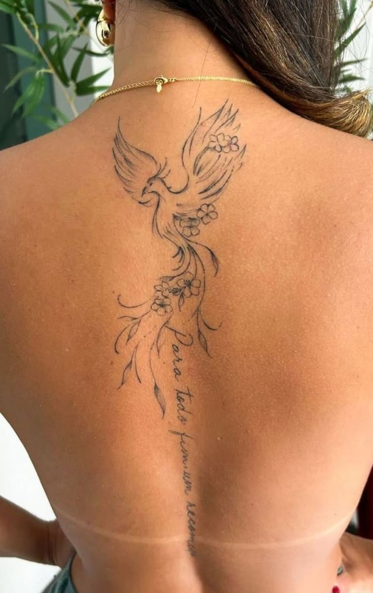 This phoenix is soft, romantic, and quietly emotional. The bird rises along the spine with loose floral accents and fine script, creating a piece that feels more like a personal poem than a bold statement. It has a lovely feminine energy, especially because the lines are airy and the whole shape follows the natural center of the back. The design’s feminine mood here is gentle but still symbolic—a beautiful nod to growth, recovery, and becoming yourself again.