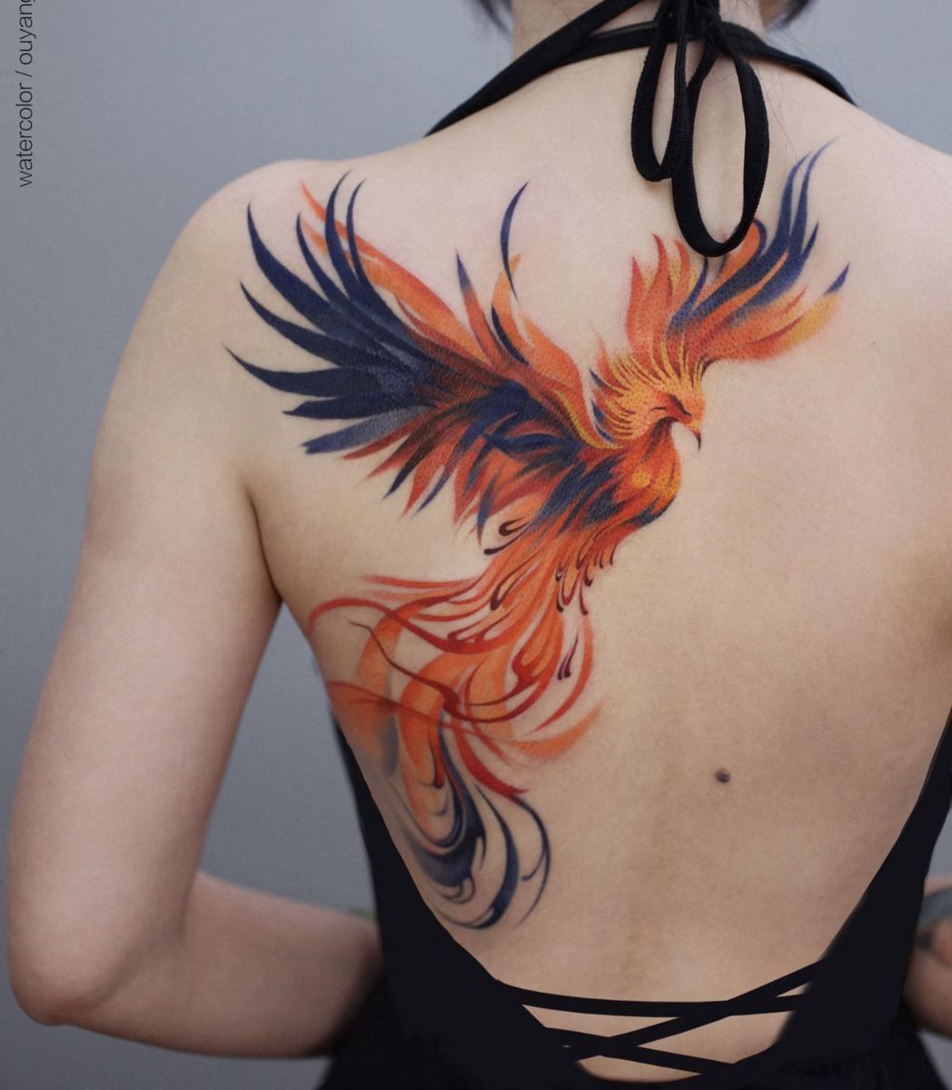 5. Vivid Watercolor Phoenix Across the Back