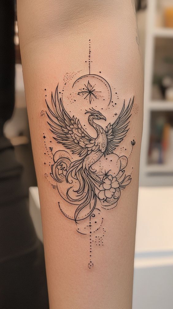 This design for women works especially well on the forearm because the vertical layout lets every detail sit neatly. It is a great option for anyone who likes fine line tattoos but still wants a complete scene rather than a tiny symbol. The flowers soften the phoenix, the dotted lines add polish, and the overall shape feels easy to personalize with initials, stars, or a subtle date.