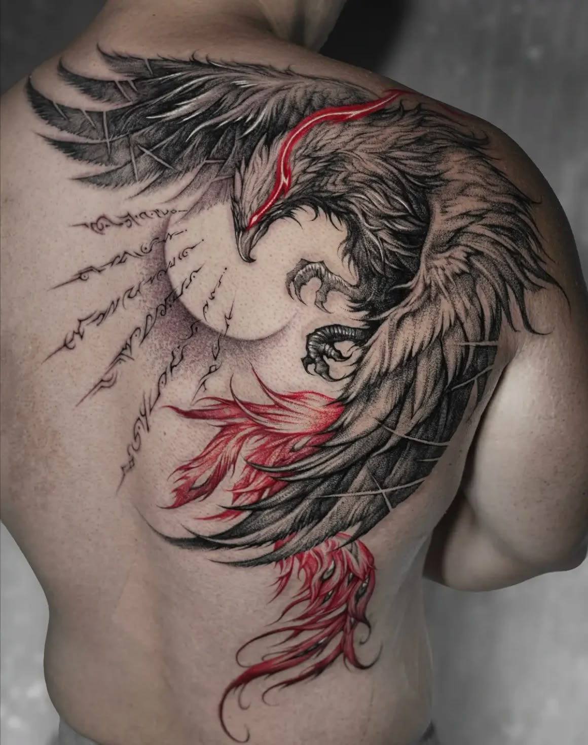 This red phoenix feels almost like wearable lace, but with fire in its bones. The symmetrical wings stretch across the back with sharp, elegant lines that create a dramatic silhouette without heavy shading. It is graceful, bold, and a little unexpected — perfect for someone who wants a phoenix tattoo that feels fashion-forward rather than traditional. The red ink gives it a striking, almost sacred energy.