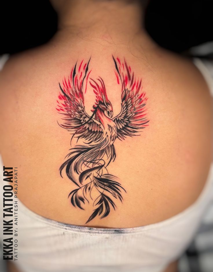 This phoenix has a gorgeous sense of lift, like it is rising straight from the center of its back with flames flickering behind its wings. The red accents add passion without making the tattoo feel too heavy, while the black feather lines keep everything elegant and defined. It has that powerful feminine “ashes” symbolism—beauty after difficulty, strength after change, and softness after survival.