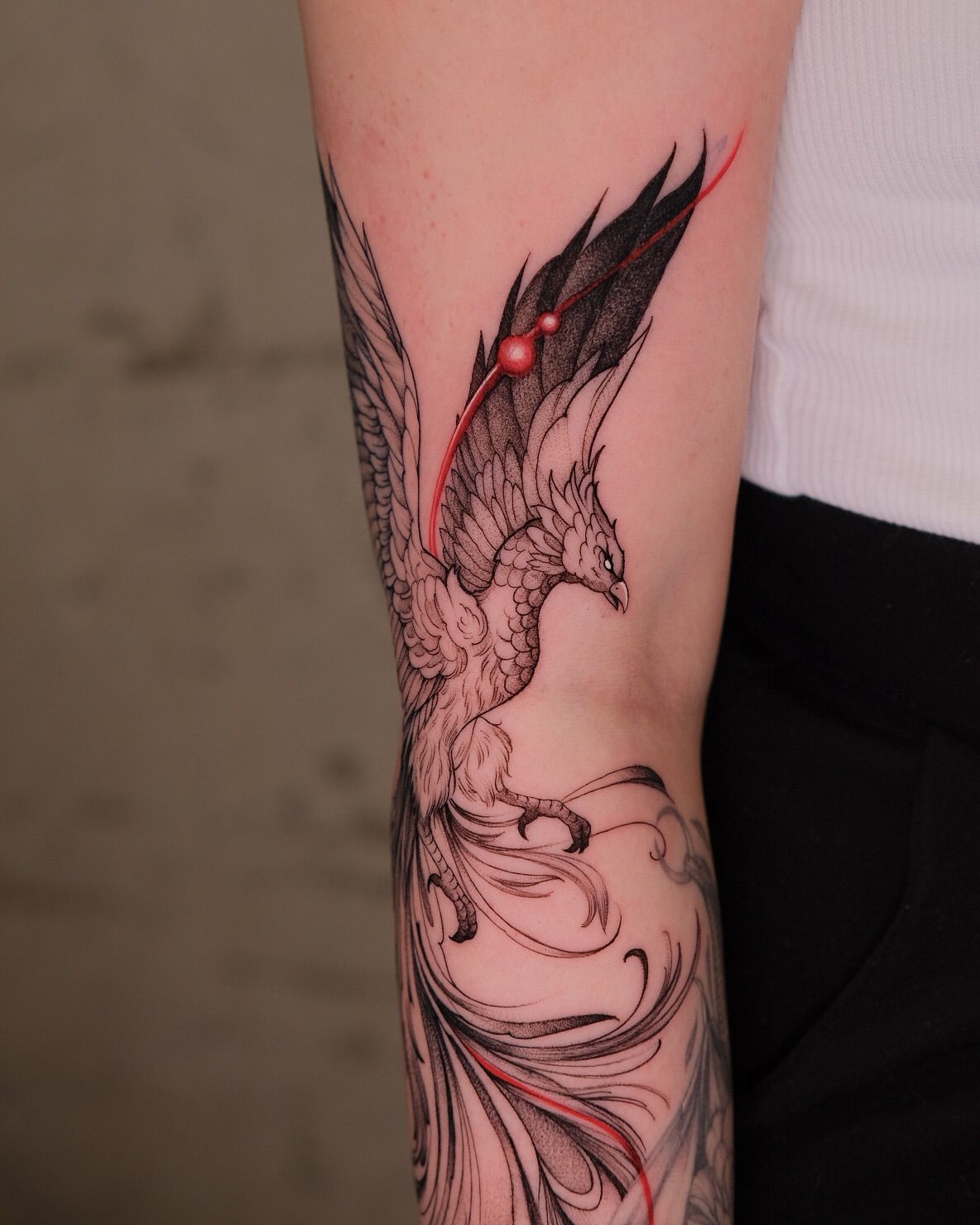 This phoenix feels elegant, intense, and beautifully controlled. The feather work is detailed without looking crowded, and the long, curling tail gives the bird a graceful rhythm down the arm. There is something almost regal about it — like a creature that has been through the fire and now knows exactly how powerful it is. The Black ink gives the design a timeless quality, while the movement keeps it from feeling stiff or overly traditional.