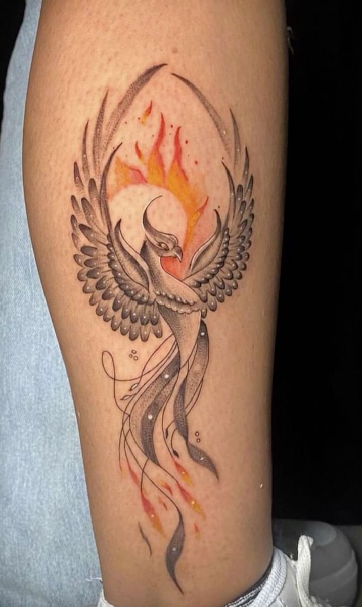 This phoenix has that golden-hour fire to it—warm, dramatic, and impossible to ignore. The orange and red tones make the bird feel alive, while the long tail feathers sweep down the leg like flames caught in motion. It carries a powerful meaning without feeling too serious, almost like a reminder that reinvention can be beautiful, bold, and a little bit glamorous. Among phoenix tattoo ideas, this one feels especially confident for anyone who wants their story of change to look vivid and full of energy.