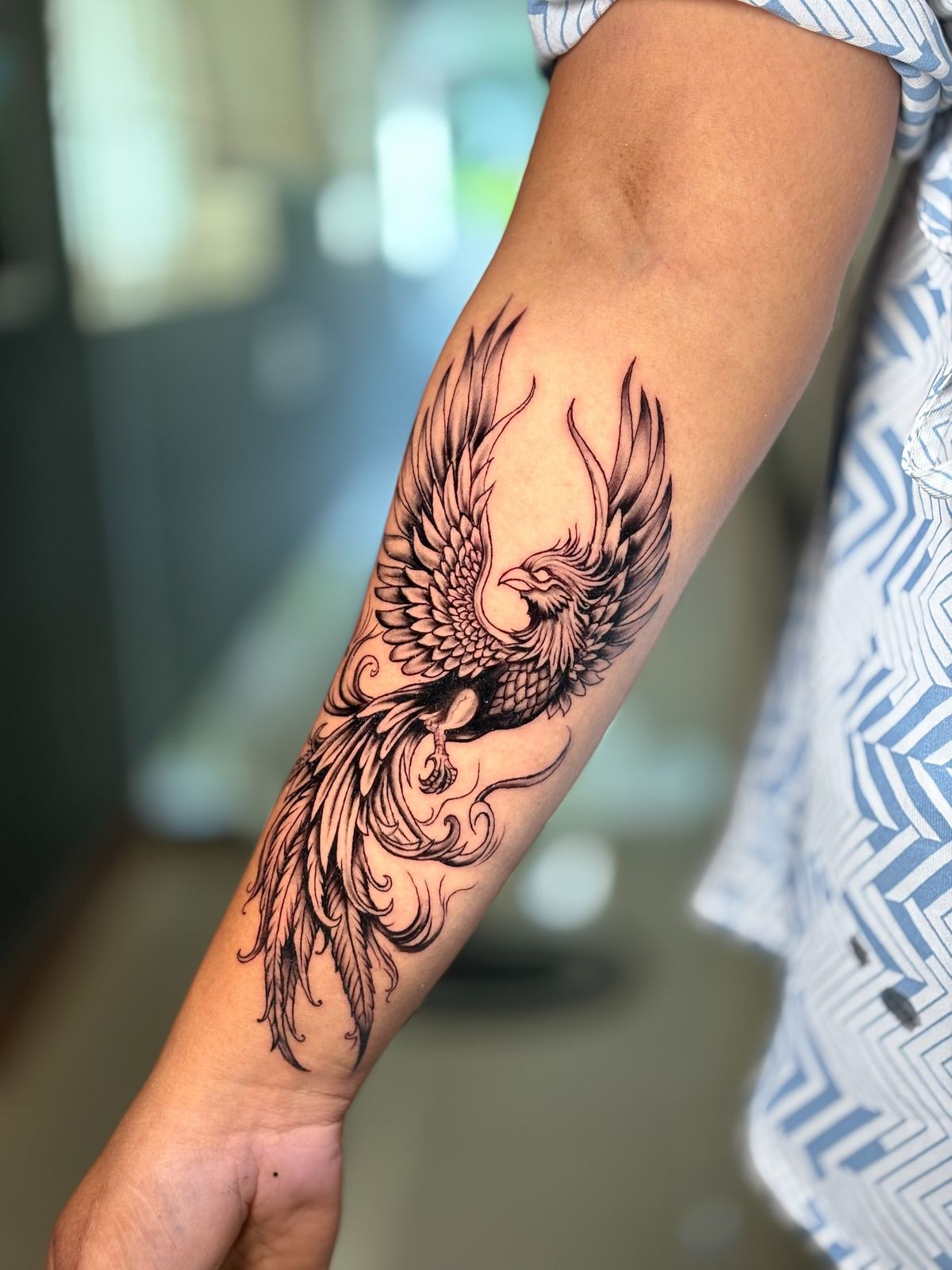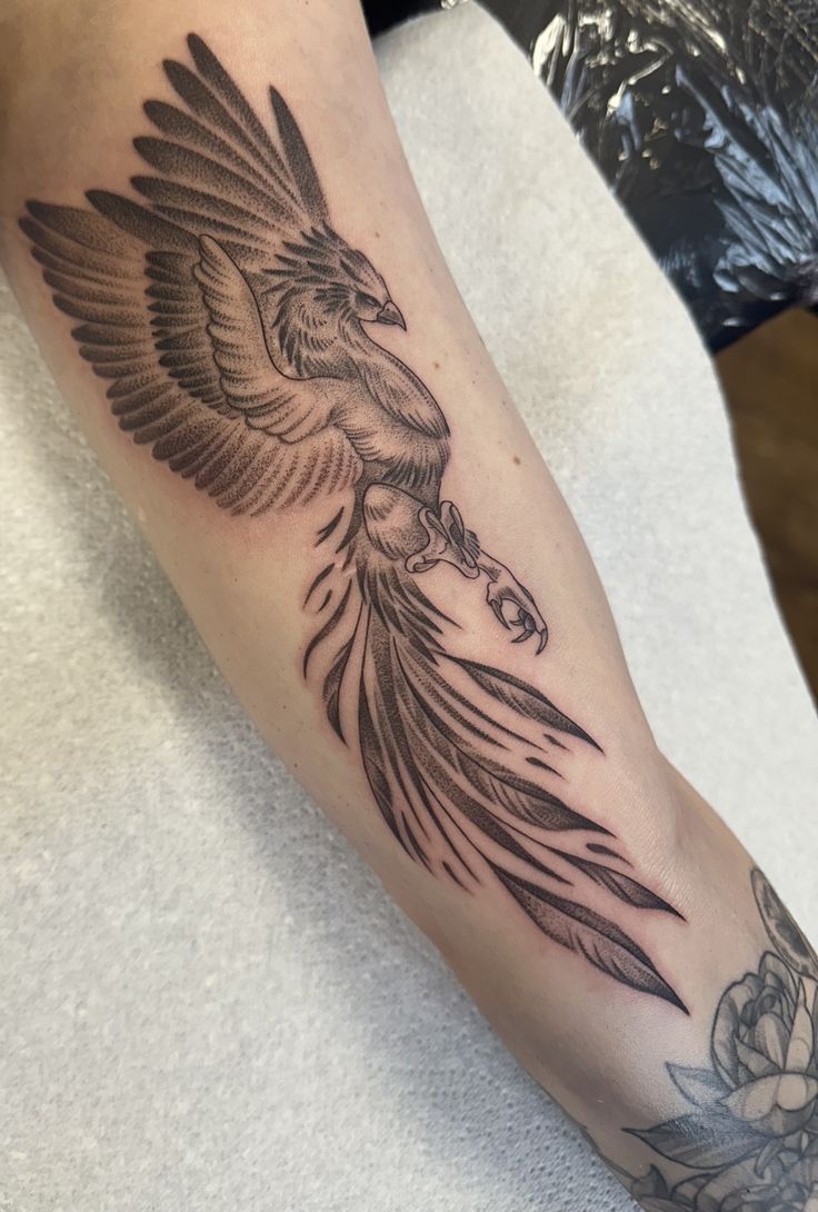 This phoenix has a classic, confident beauty. The wings are full and structured, while the long tail feathers fall like inked ribbons down the arm. It feels elegant but not delicate, strong but not harsh. There is a quiet maturity to it — the kind of design that looks like it belongs to someone who knows exactly who they are and does not need to explain every chapter of the story.