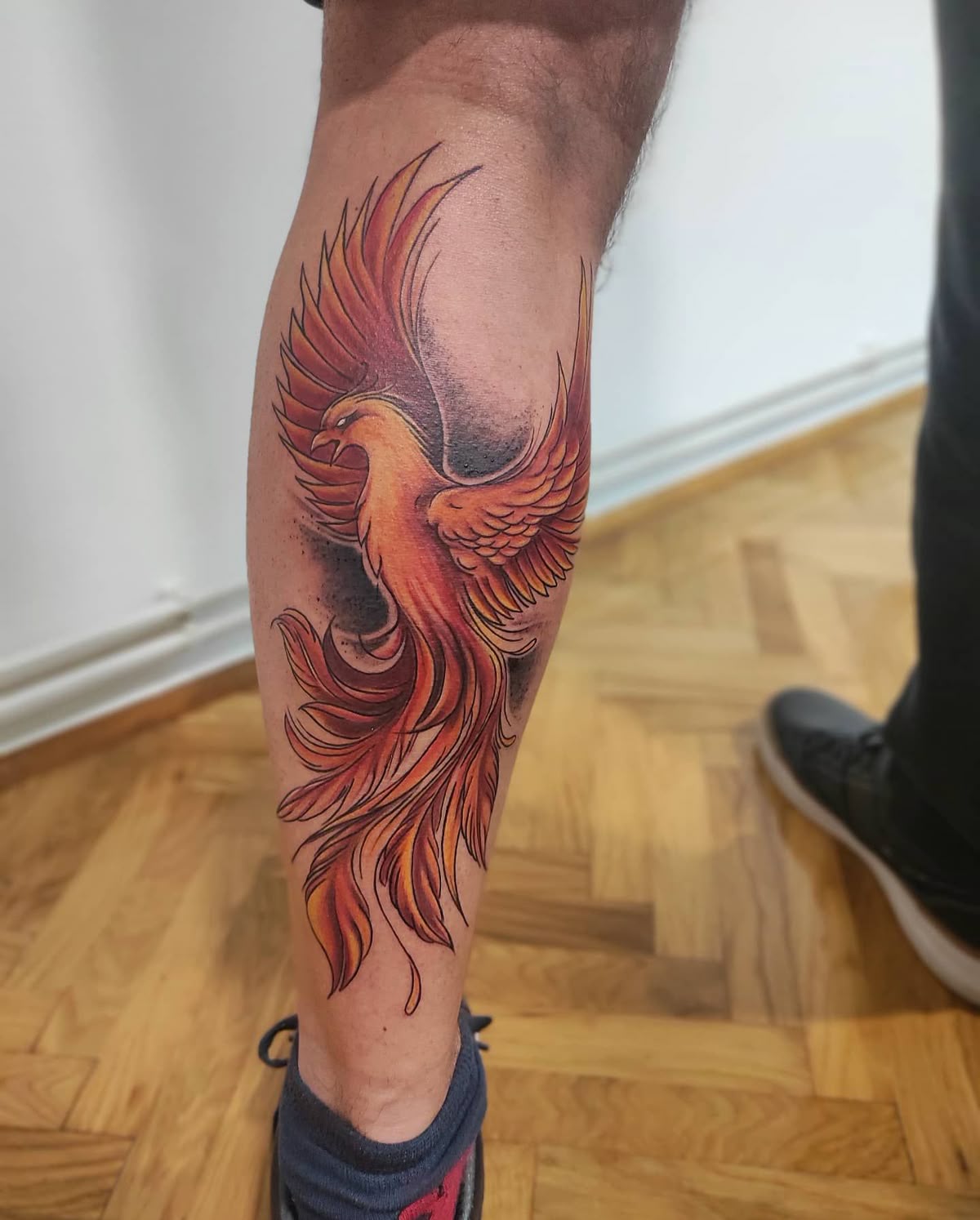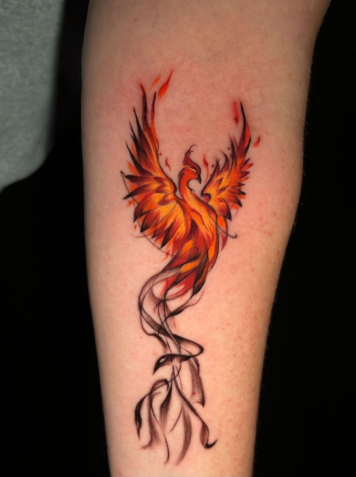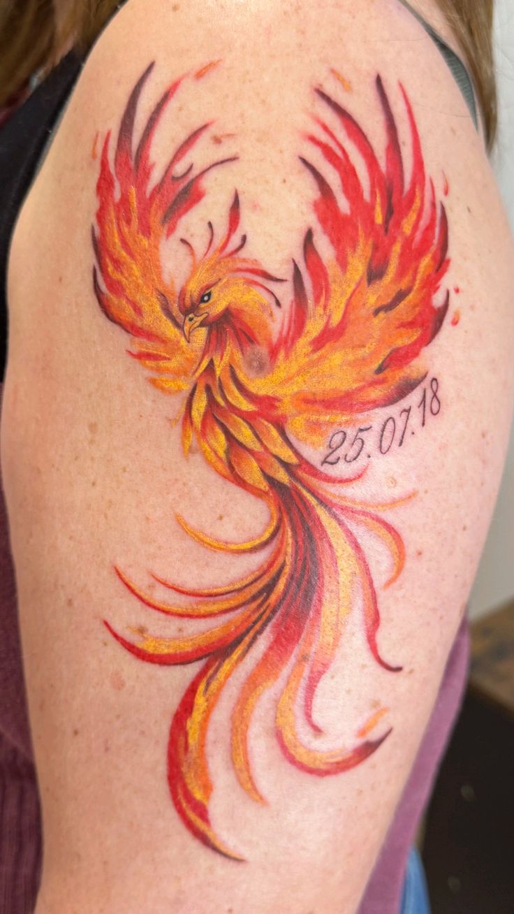 This tattoo feels personal right away. The phoenix is bright, fiery, and full of sweeping movement, but the small date detail adds a private heartbeat to the design. It turns the piece into a memory, not just an image. The red, orange, and yellow tones create the feeling of flames in motion, while the long tail feathers keep it elegant and feminine instead of overly bold.