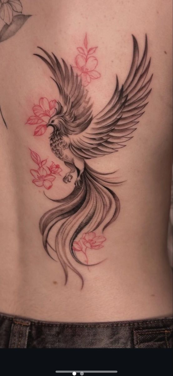 This phoenix is beautifully soft without losing its strength. The shaded wings and flowing tail create that classic rising-bird shape, while the pink flowers add tenderness and a little romantic charm. It feels like a tattoo about healing, not just surviving—the kind of piece that says you came through the fire and still chose beauty. That mix of power and softness is exactly why phoenix tattoos stay so timeless.