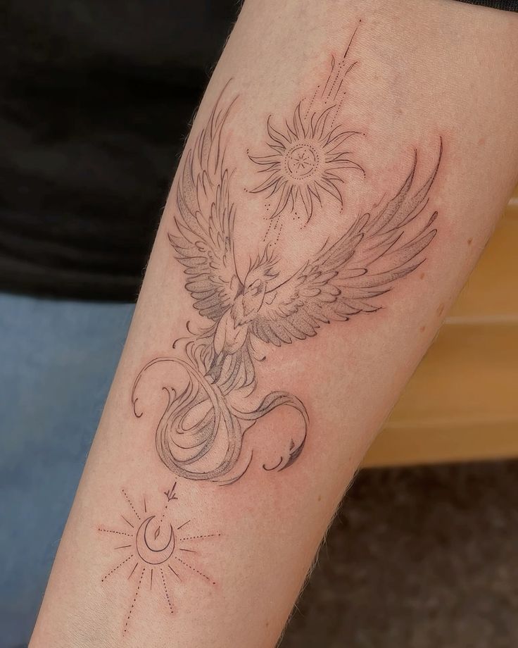 This phoenix feels dreamy, spiritual, and a little magical. The bird is drawn with pale, delicate lines, while the sun and moon details add a sense of balance—light and dark, endings and beginnings, rest and rebirth. It is not a loud tattoo, but it has a very intimate beauty. For someone who wants phoenix tattoo ideas with gentle symbolism, this one feels especially poetic.
