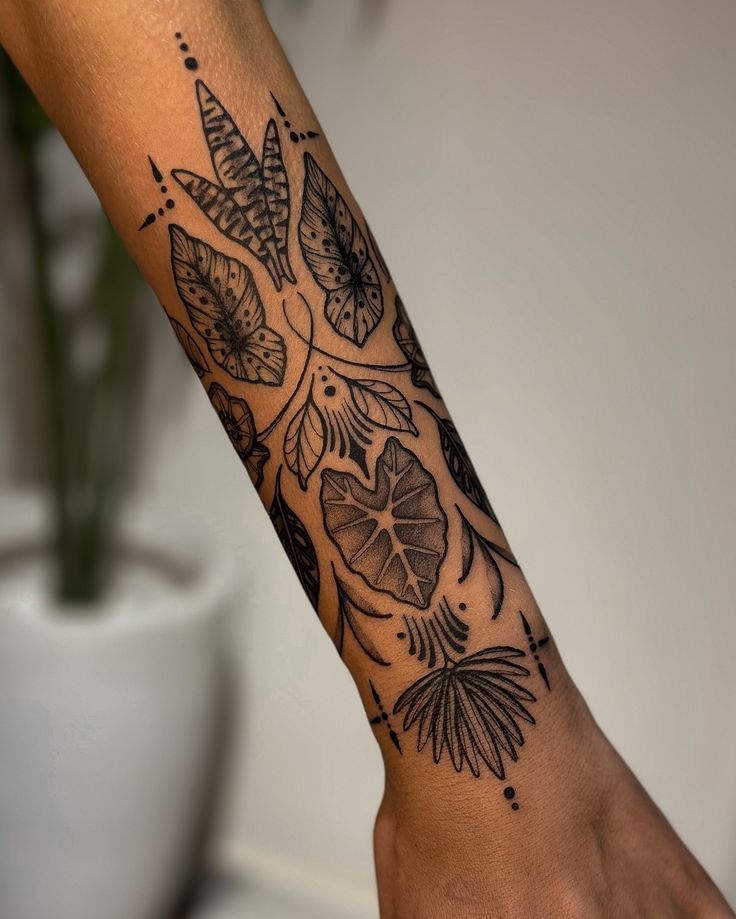 This design feels like movement—like leaves caught in a slow, stylish breeze. The shapes are sleek and a bit mysterious, with that modern, almost fashion-illustration vibe. It’s dramatic without being loud, and it gives your arm this elegant, elongated look that feels instantly confident, like you’re wearing a statement piece that never goes out of style.