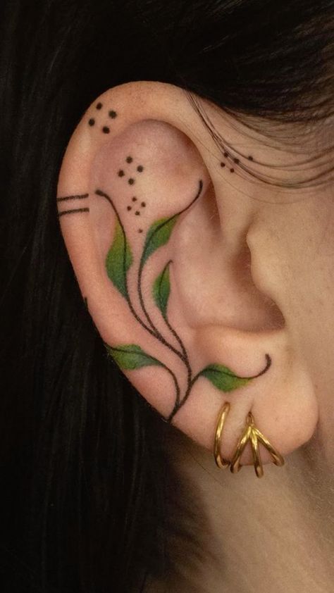 Low-maintenance angle: small ear tattoos can be super easy to live with because they’re quick to cover with hair and don’t dominate your look. Keep it simple—clean lines, small leaf shapes, and minimal shading—so the design stays readable over time. During healing, avoid sleeping on that side and be careful with hair products and headphones. Once healed, a little SPF goes a long way to keep the green looking bright and clean.