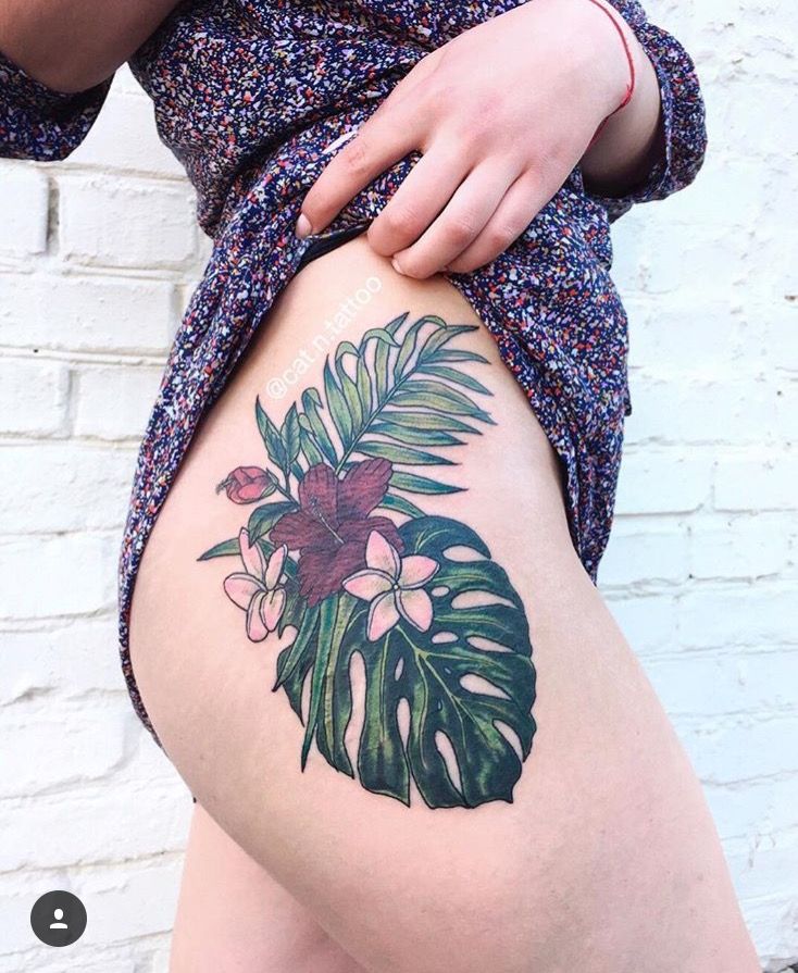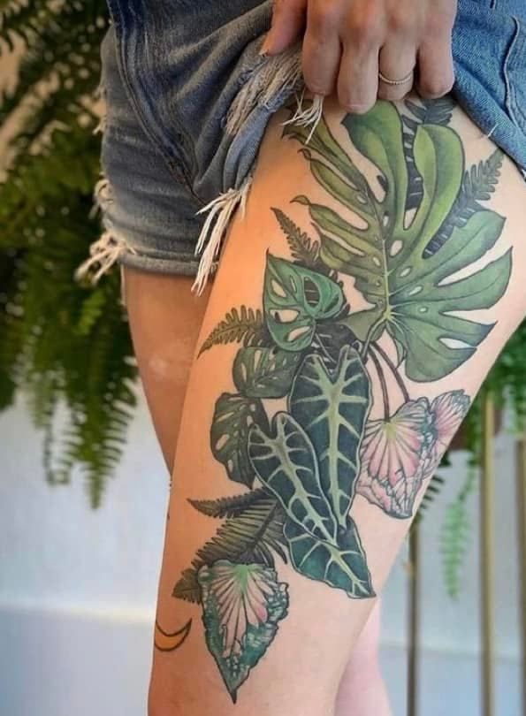 Trend-wise, big Tropical plant ideas like this are having a moment because they photograph beautifully and look striking from a distance—perfect if you like tattoos that feel like wearable art. The leg placement gives you room for color gradients and leaf overlap, so it doesn’t turn into a flat patch. If you’re worried about fading, ask for slightly deeper greens and strong outlines; then commit to SPF once it’s healed, especially if you live in shorts all summer.