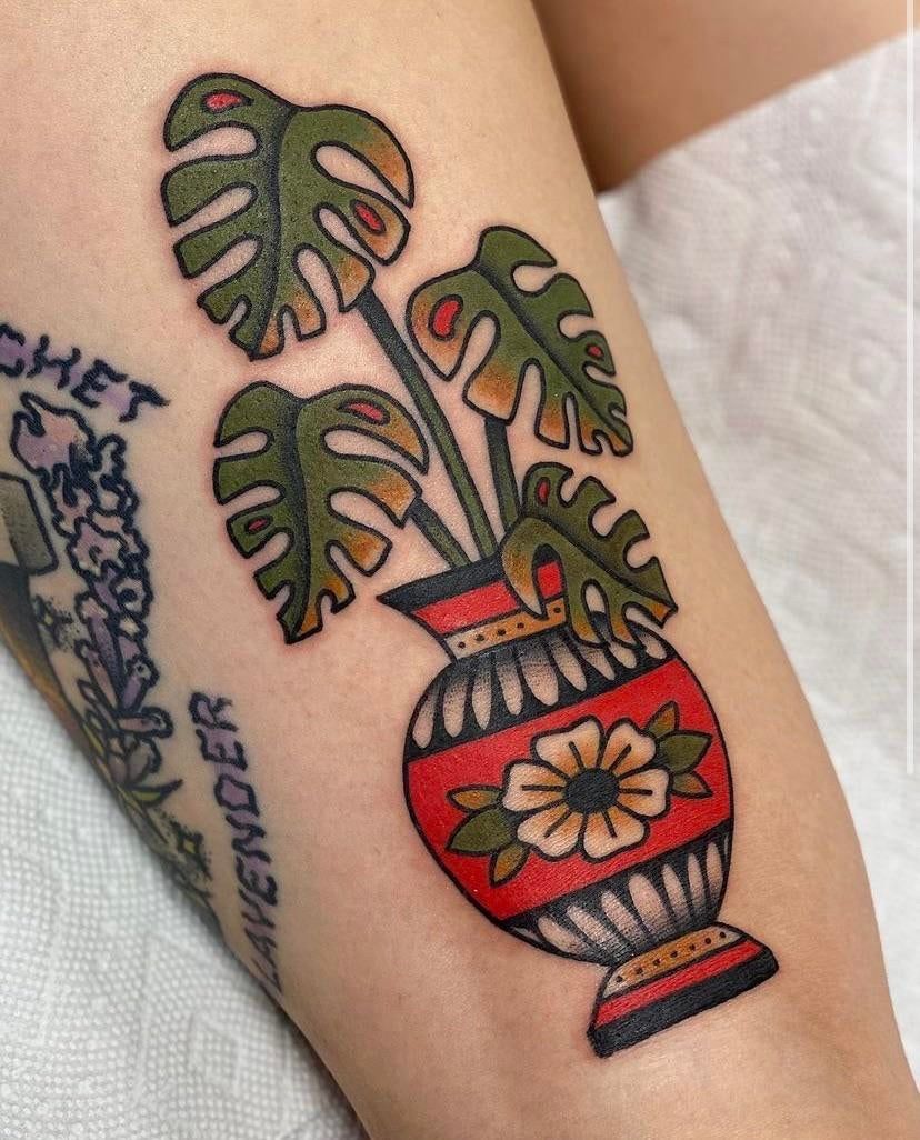What makes it unique is the Traditional approach: strong outlines, clean color blocks, and a clear silhouette that won’t disappear with time. If you love Monstera but you don’t want a delicate look, this is a perfect middle ground—playful, readable, and built to last. Tell your artist you want solid contrast between the leaves and vase so it stays sharp, and keep the shading simple so it heals evenly.
