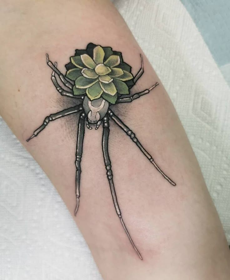 Vibe-wise, this design is a statement for men and women who like their tattoos to have attitude. It looks amazing on the arm or leg because the long lines of the Spider can stretch naturally and stay readable. Keep the plant portion slightly larger than you think so the petal layers don’t blur over time, and ask for subtle dot shading behind it to give depth without turning the whole piece dark. It’s bold but still beautifully balanced.