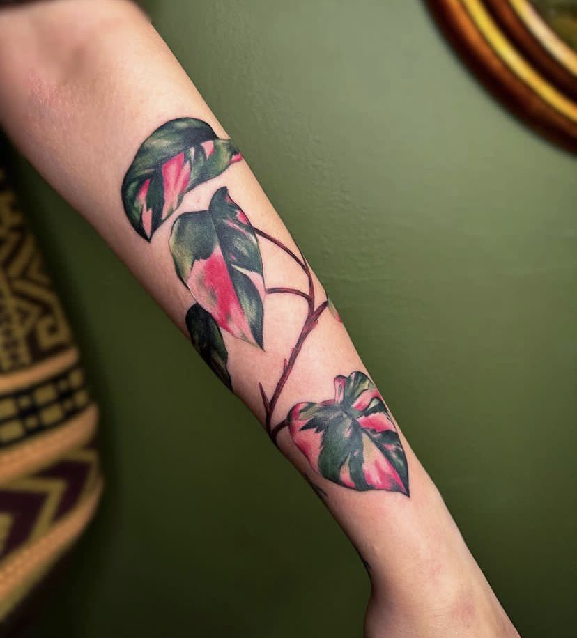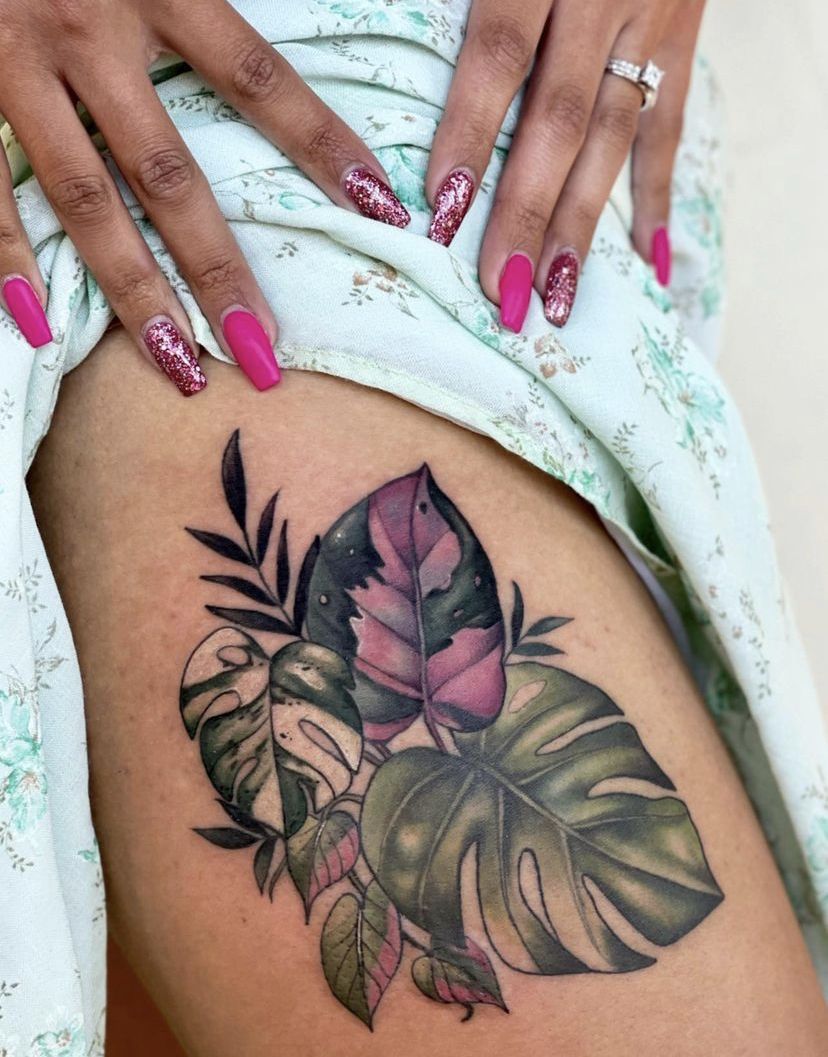 Current trends: color-forward botanicals are huge right now because they photograph so well and feel more custom than plain black ink. If you love Tropical plant ideas but want something a bit softer and more wearable day-to-day, this is a great lane. Keep the leaf shapes bold and the shading smooth so it heals evenly, and ask for clear contrast between the pink and green areas. With good SPF, those tones can stay vibrant and flattering for years.