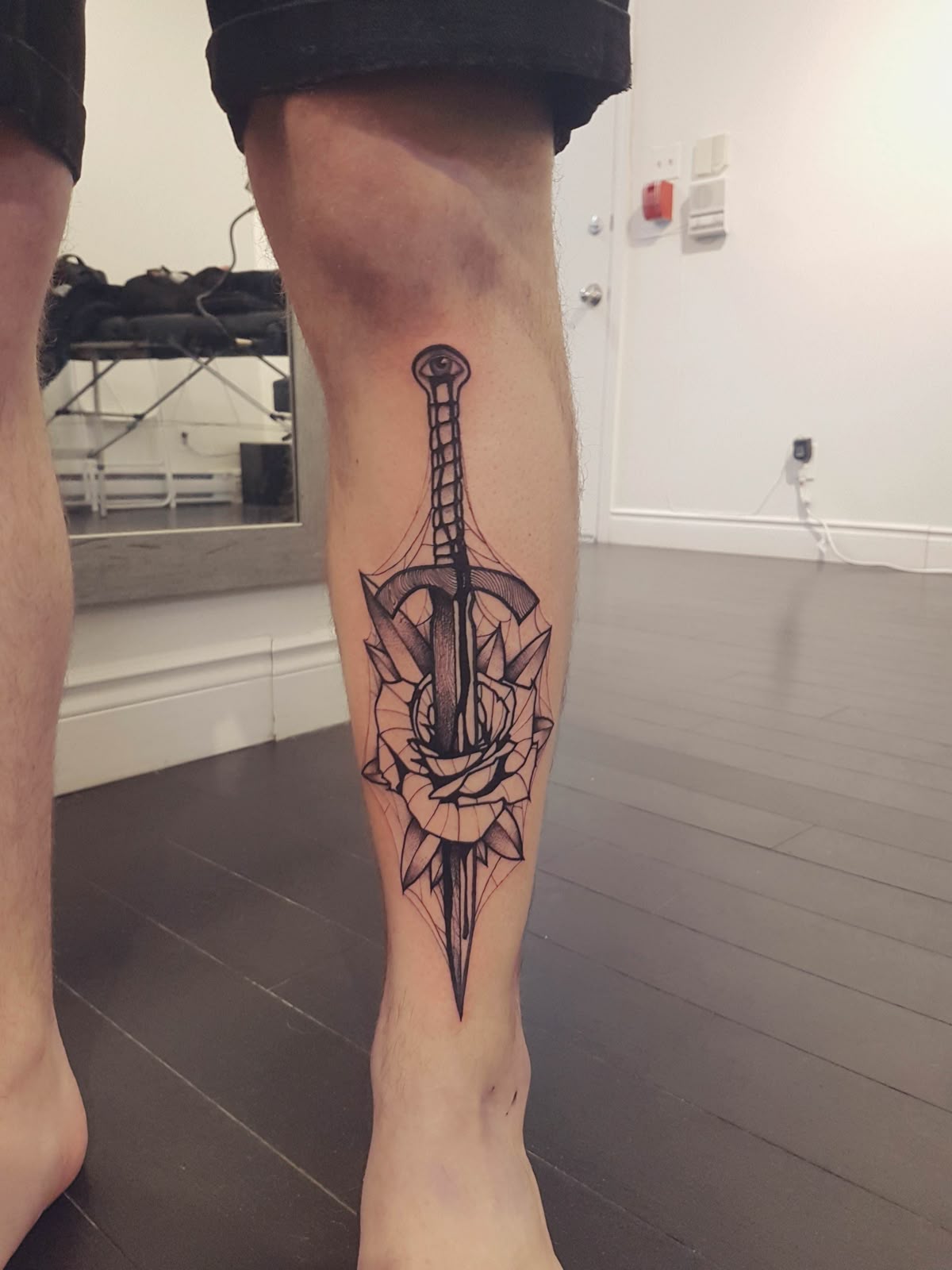 1. Dagger and Rose Traditional Shin Tattoo