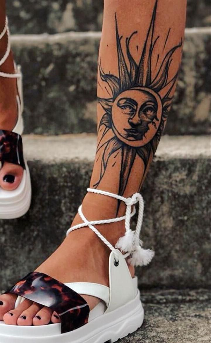 There’s something nostalgic about a bold sun face design. It feels slightly mystical, slightly Traditional, and full of personality. The elongated rays stretching along the Lower leg give the illusion of length and movement, making the shin feel like the perfect placement for this cosmic symbol.