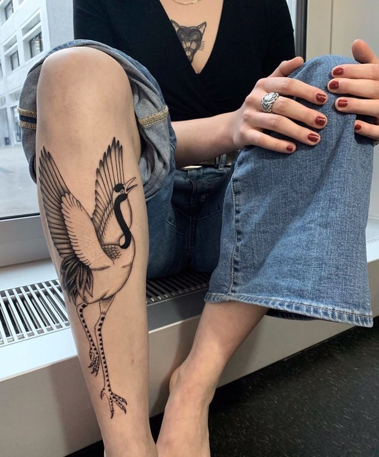 A tall crane stretching its wings up the Lower leg feels refined and quietly powerful. There’s movement in the feathers, but also a sense of grace—like it’s mid-step. The vertical composition makes the leg look longer, more sculpted, and more intentional.