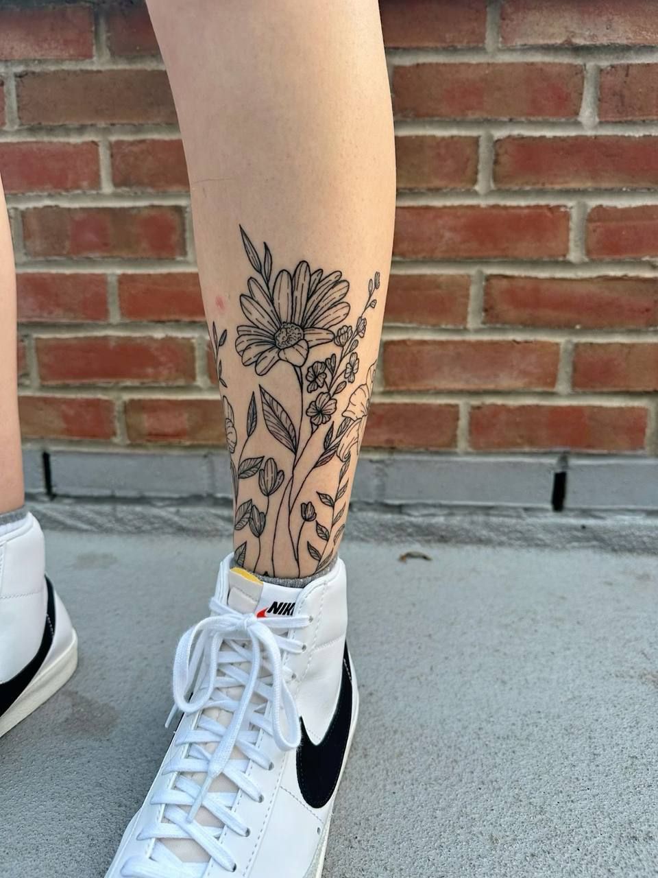 A delicate Floral bouquet flowing down the shin feels soft, natural, and effortlessly stylish. The fine lines give it that airy, sketched quality—almost like it was drawn in ink pen rather than tattooed. It’s romantic without being too sweet, subtle but undeniably eye-catching.