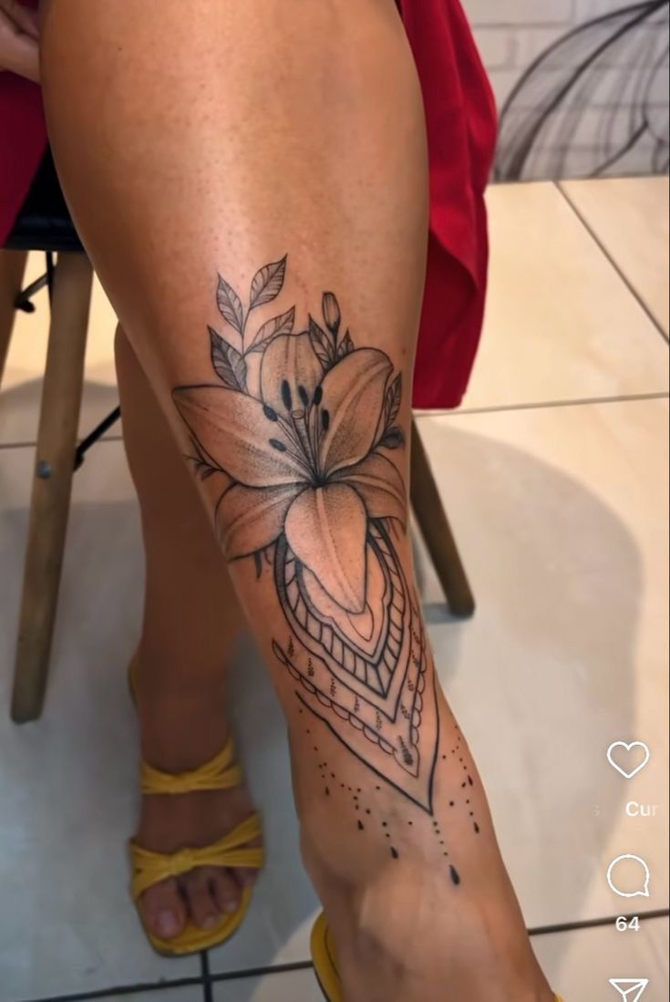 What makes this design special is how it blends Floral beauty with sharp line precision. These women’s ideas feel contemporary—especially for women who want something expressive but not overwhelming. It’s one of those shin tattoo ideas that transitions easily from sandals to heels without ever feeling out of place.
