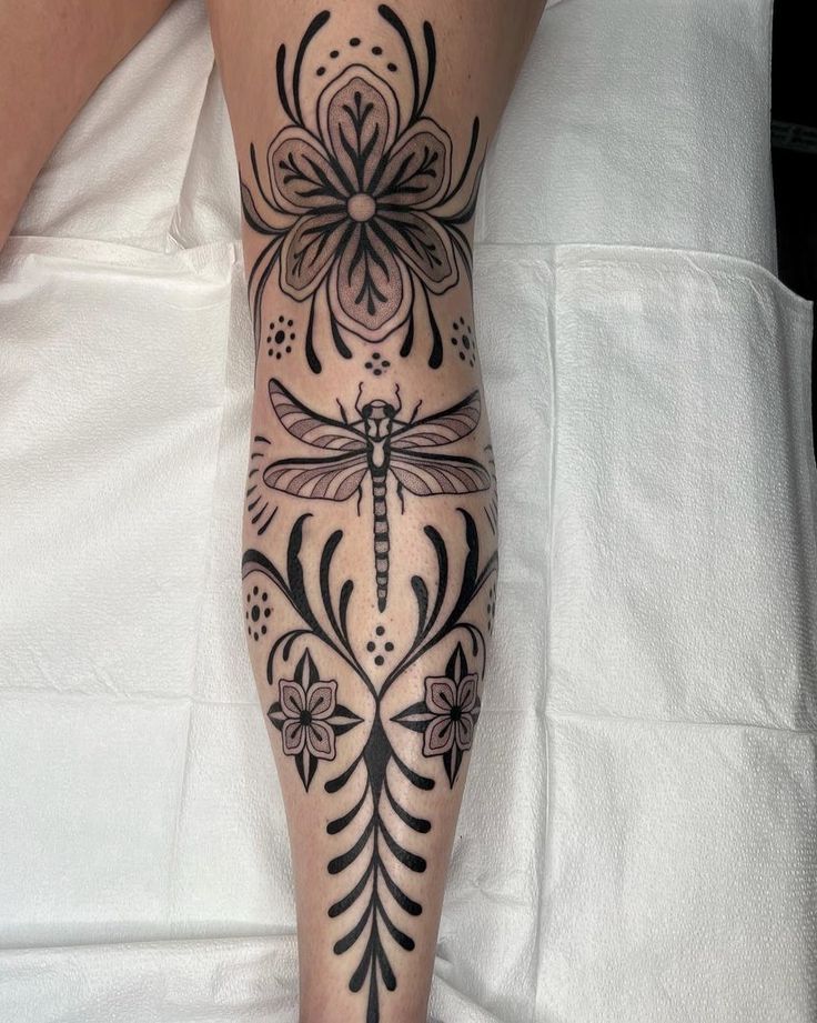 This Symmetrical composition feels like wearable art. A bold Ornamental flower anchors the top of the shin, while a perfectly centered Dragonfly stretches its wings beneath it. The flow continues downward with mirrored botanical lines that gently frame the Lower leg. It has that balanced, almost meditative energy—structured, yet soft enough to feel Feminine and graceful.