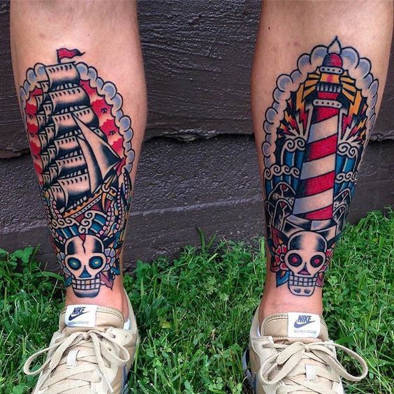 A colorful lighthouse on one shin and a tall ship on the other—this Matching concept is classic American traditional storytelling. It feels nostalgic, adventurous, and full of character. The skull accents add a playful edge without overpowering the design.