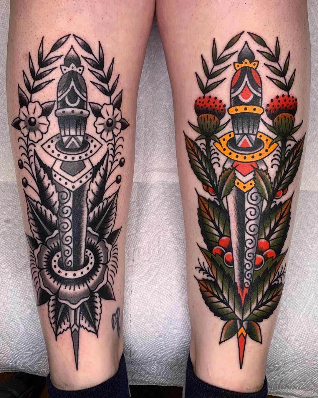 This Matching dagger set is pure American traditional attitude. One leg shows a classic black-and-grey men’s design, while the other brings in bold color and Floral accents. Together, they feel balanced but not identical—like two sides of the same story.