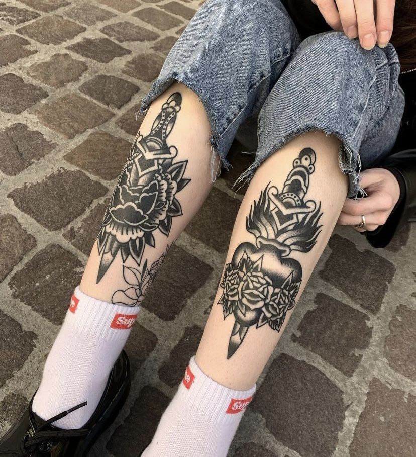 There’s something unapologetically bold about a classic dagger piercing through a rose on the shin. It feels a little rebellious, a little romantic—like you’ve lived a story or two and aren’t afraid to show it. The symmetry of placing similar pieces on both legs adds that subtle Matching edge, while the heavy black lines nod to Traditional roots. It’s the kind of design that turns simple rolled-up jeans into a full fashion moment.