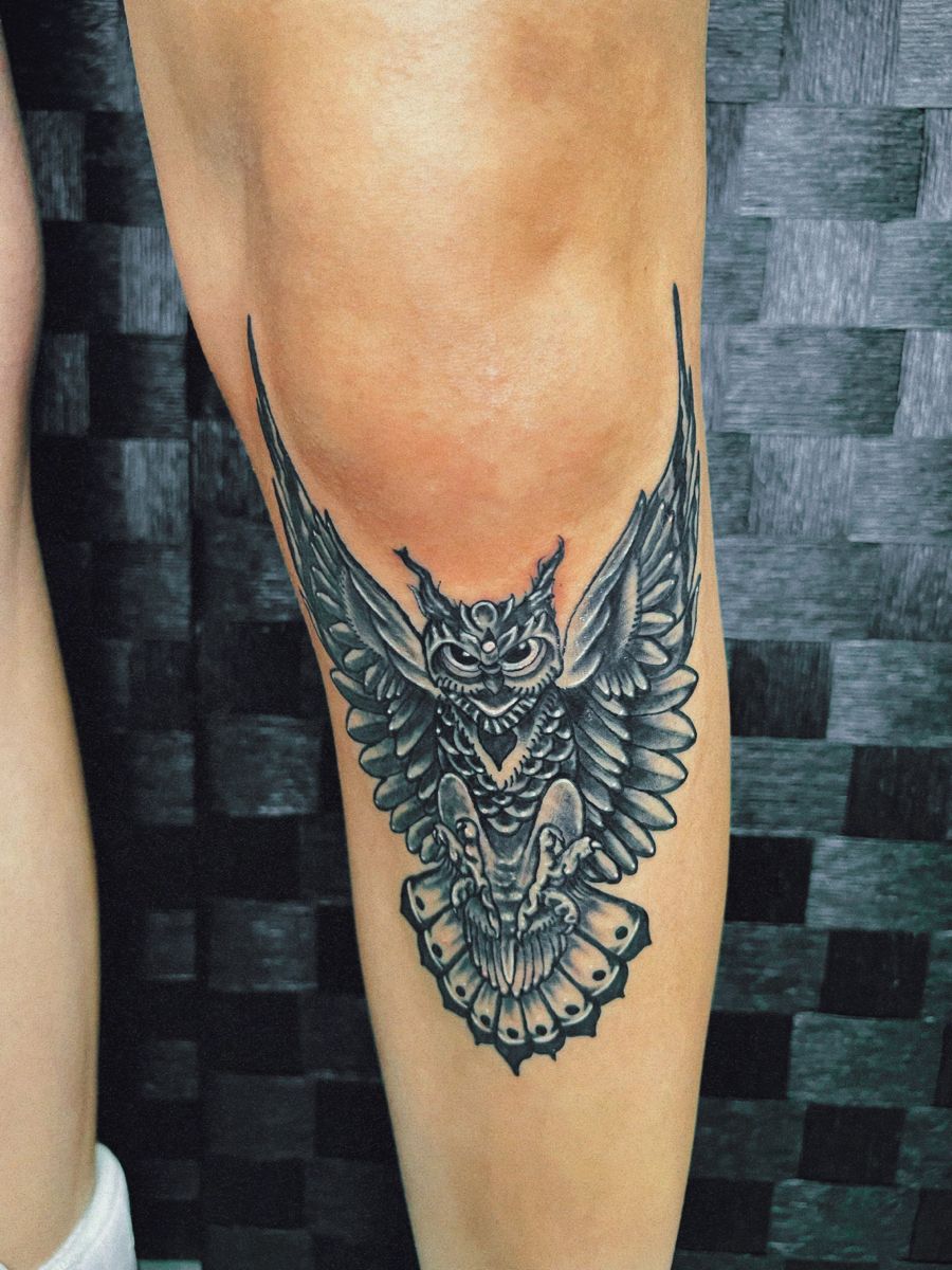 An owl spreading its wings across the shin feels wise, protective, and a little mystical. The detail in the feathers and the intense gaze give it personality—almost like it’s guarding your path. There’s a grounded energy to it that works whether you lean edgy or earthy in your style.