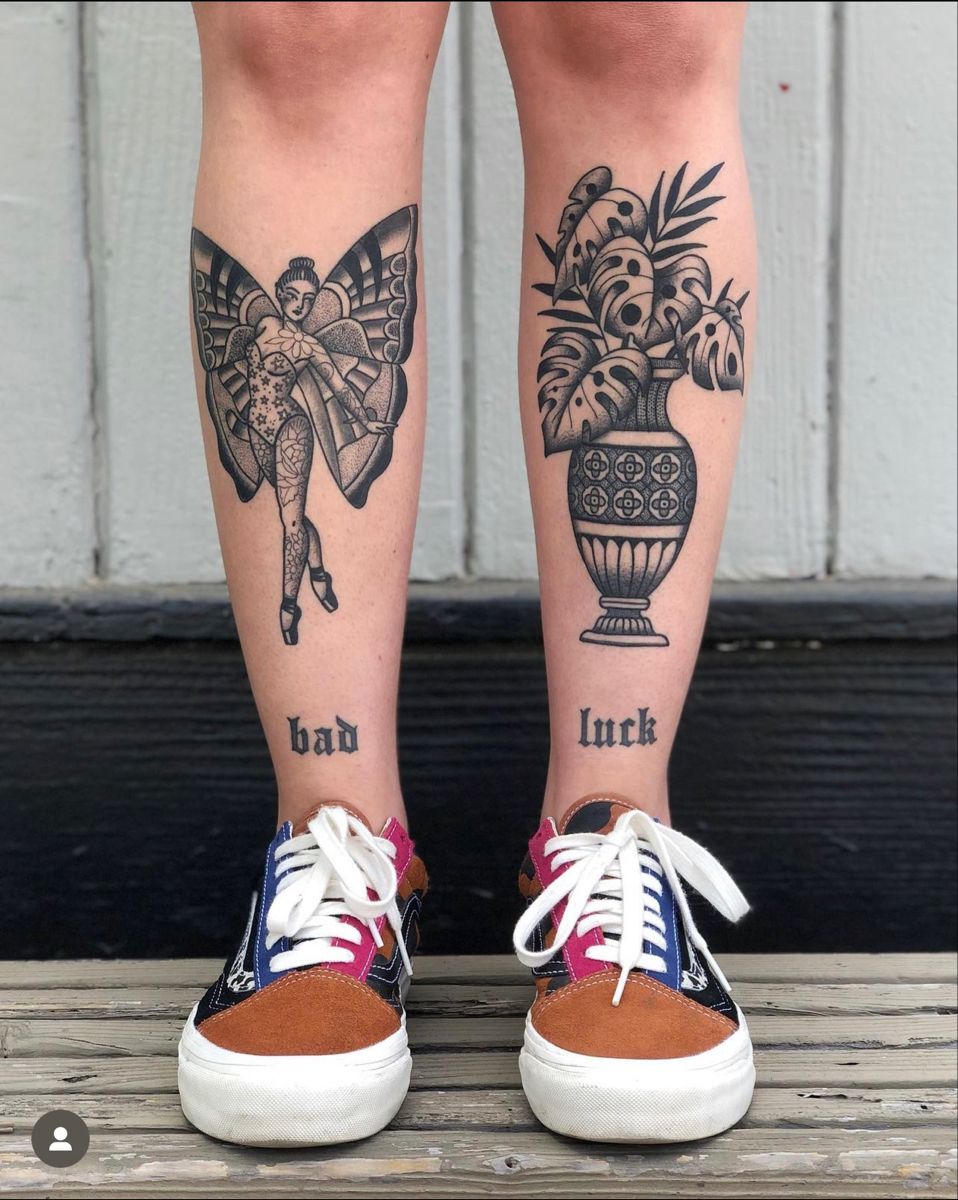 There’s a playful contrast here—a delicate winged figure on one shin and a structured botanical vase on the other. It feels storybook-inspired but grounded in strong linework. The pairing adds a subtle Matching energy without mirroring exactly, which makes it feel intentional and stylish.